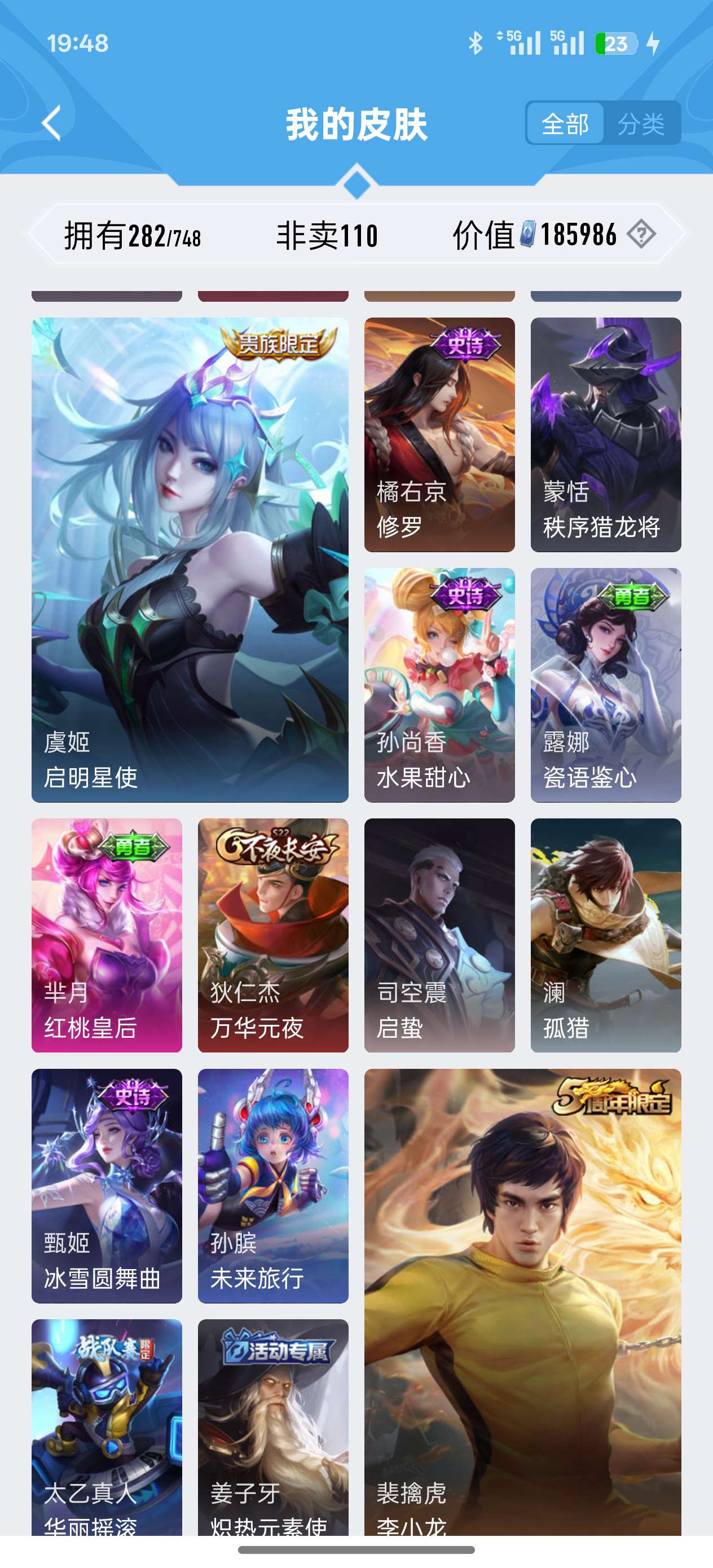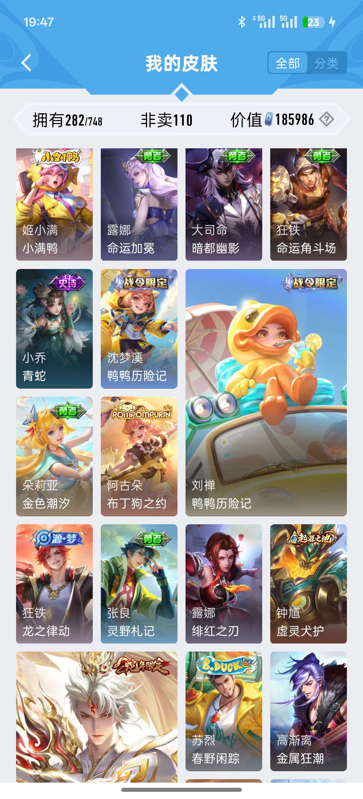 苹果QQ 皮肤282 英雄126 典藏1 传说7 其他皮肤104 至尊星耀-有和平营地王者皮肤多多