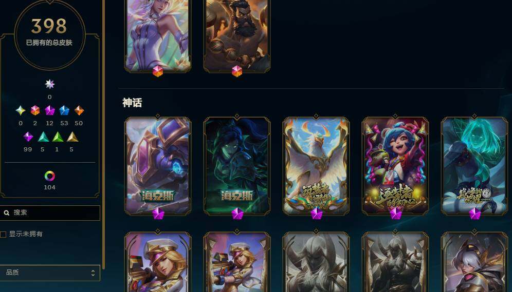 166英雄/398皮肤/2终极/12神话/53限定/4臻彩/114炫彩/50传说/99史诗/未定级/