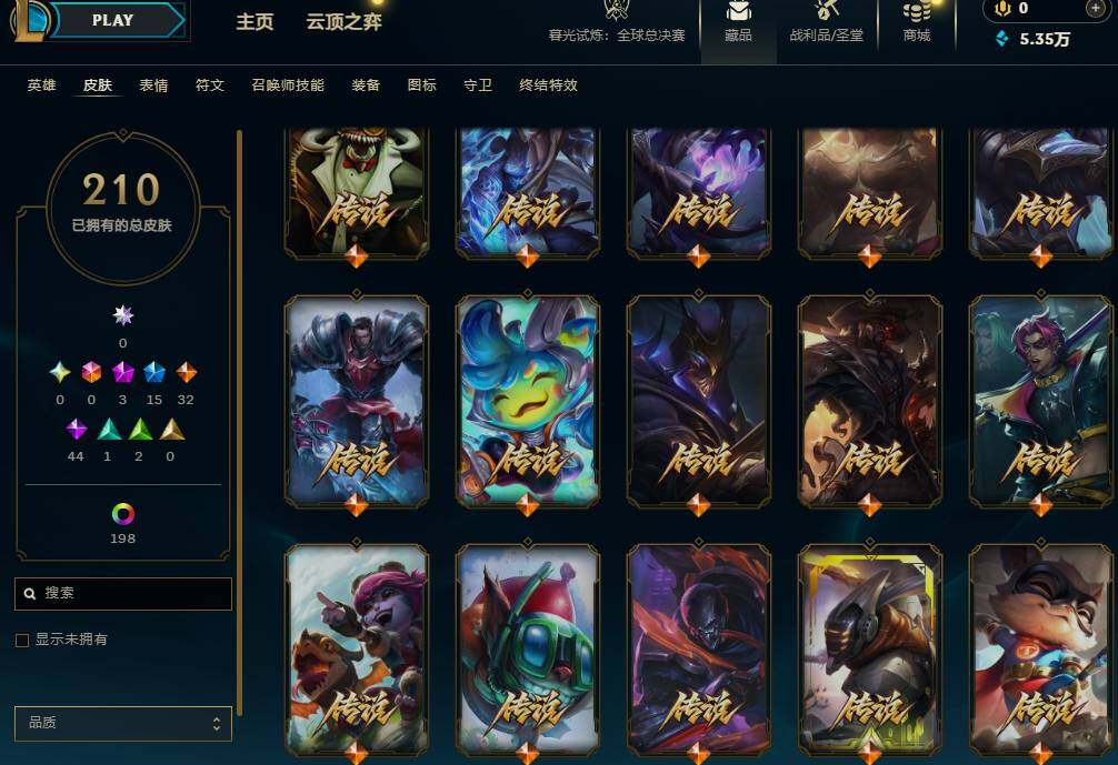 172英雄/210皮肤/3神话/15限定/9臻彩/222炫彩/32传说/44史诗/白银/