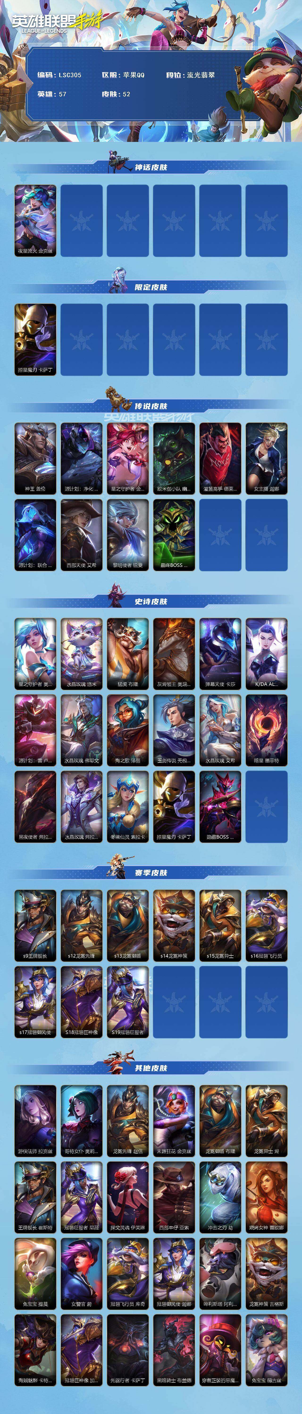 【LSC305】57英雄/52皮肤/流光翡翠/夜星流火 金克丝/掠星魔刃 卡萨丁/神王 盖伦/源计划:净化 薇恩/星之守护者 金克丝/欧米伽小队 幽灵特工 提莫/灌篮高手 德莱厄斯/女主播 迦娜/源计划:联合 艾希/西部天使 艾希/黎明使者 锐雯/最终BOSS 维迦/星之守护者 奥莉安娜/水晶玫瑰 悠米/猛虎 布隆/灰烬领主 奥瑞利安·索尔/弹幕天使 卡莎/K/DA ALL OUT 卡莎/源计划:雷 卢锡安/水晶玫瑰 佛耶戈/海之歌 泽丽/玉剑传说 无极 易/水晶玫瑰 艾希/暗星 墨菲特/黑夜使