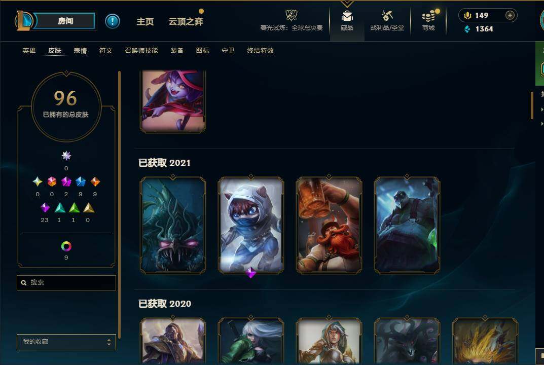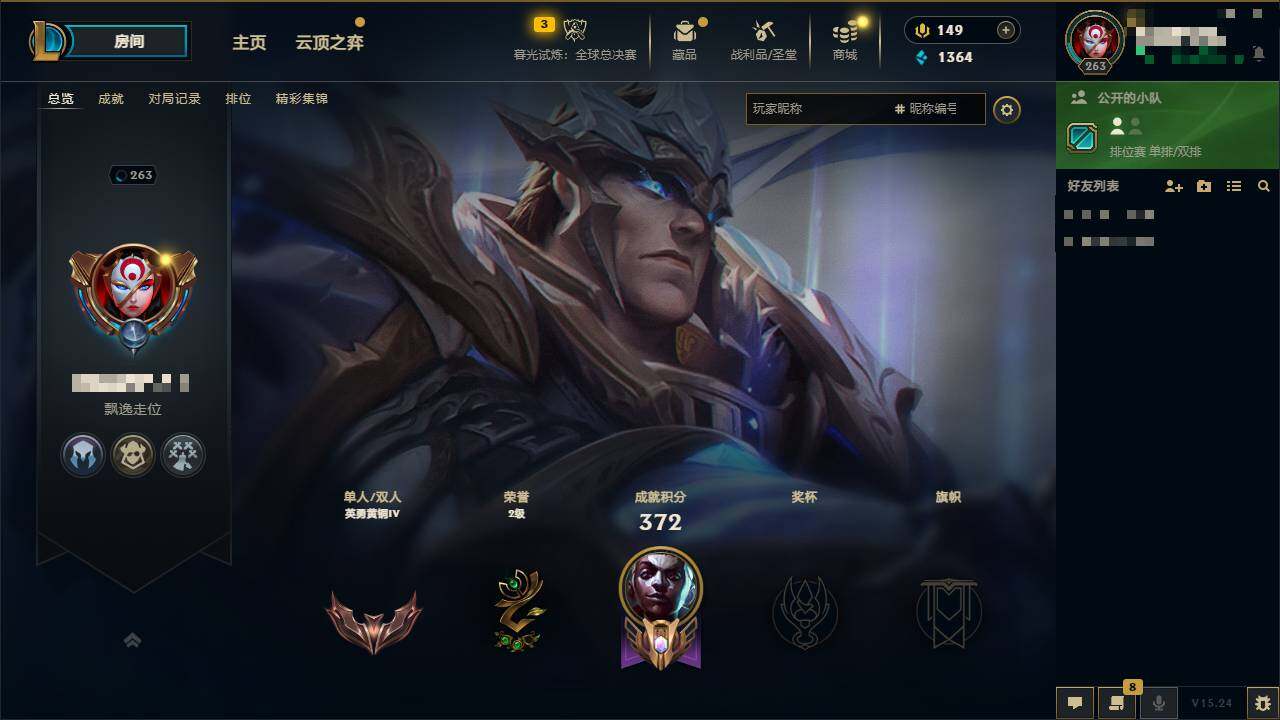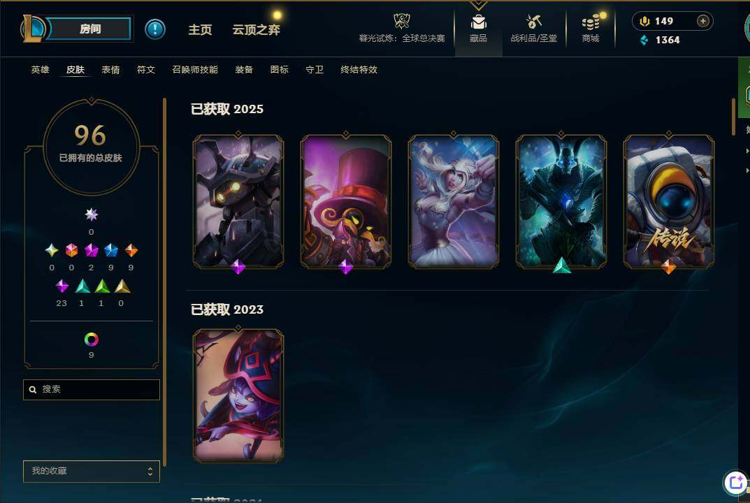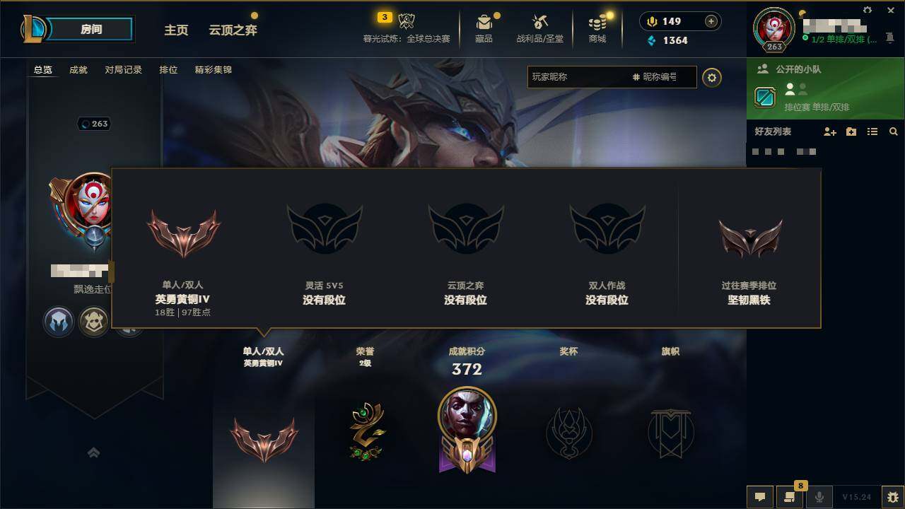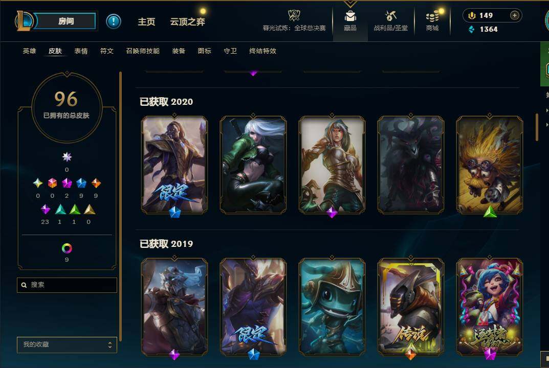 124英雄/96皮肤/2神话/9限定/10炫彩/9传说/23史诗/青铜账号等级:263/