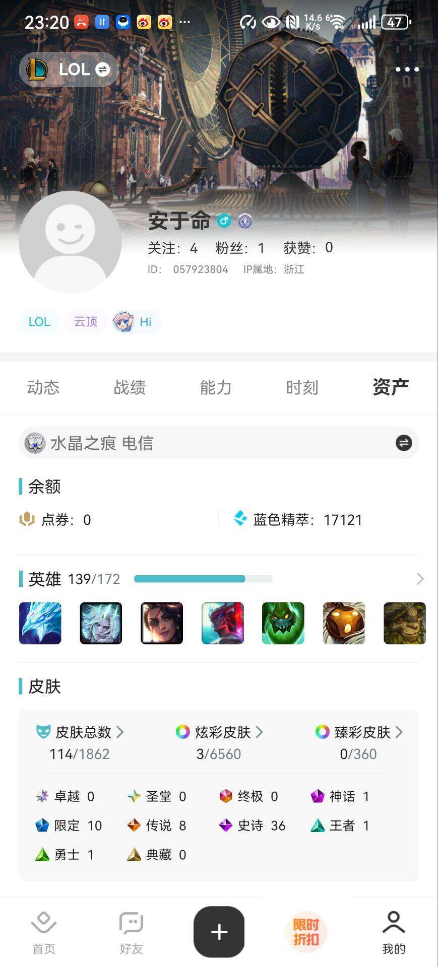 【特价出售/店主推荐】未定级段位-139英雄-114皮肤-3炫彩-0终极-1神话-10限定-8传说-36史诗