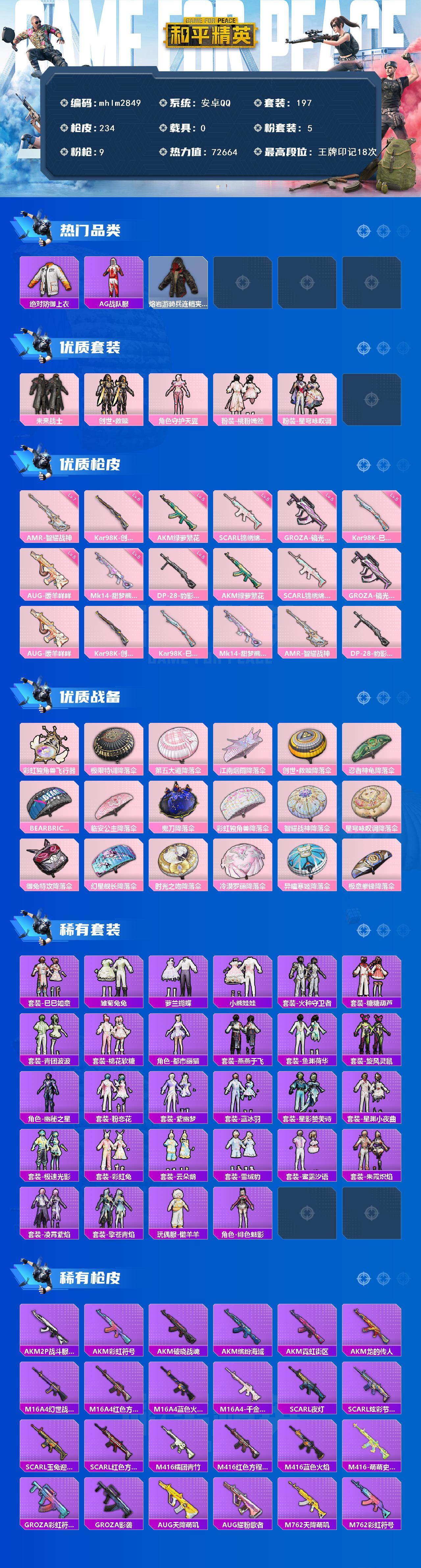 【mhlm2849】安卓 手Q-5粉装-9特效枪-0载具-2粉色飞行器-72664热力值-18王牌印记-197套装-234枪皮