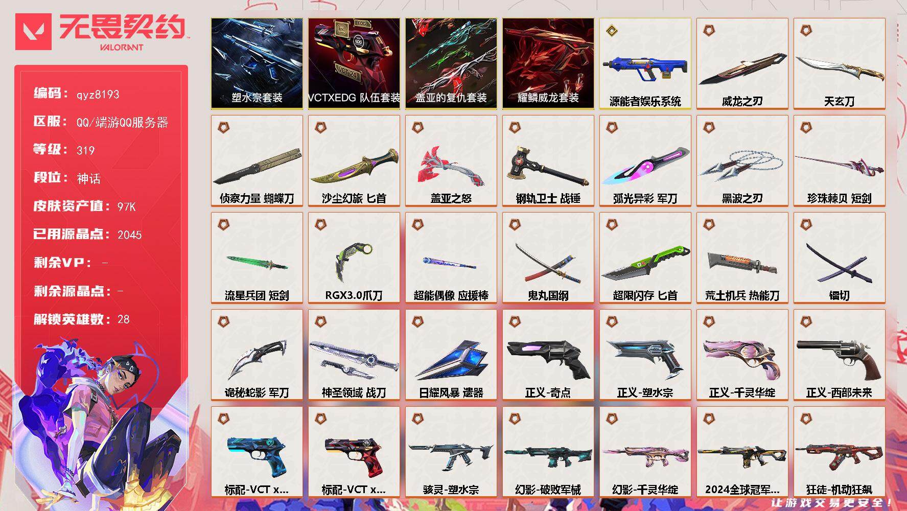 【qyz8193】21 23 25ak 24m4 单卖很多精品枪 最高神3 有俩神话挂坠 qyz8193 亮点皮肤: 狂徒-2023全球冠军赛,狂徒-2021全球冠军赛,幻影-2024全球冠军赛 套装: 盖亚的复仇套装,塑水宗套装,耀鳞威龙套装,VCTCN2025套装 近战武器皮肤: 盖亚之怒,军刀-弧光异彩,蝴蝶刀-侦察力量,天玄刀,匕首-沙尘幻旅,黑波之刃,威龙之刃,短剑-珍珠棘贝,落英飞旋,超能偶像 应援棒,爪刀-RGX 11z Pro 3.0,短剑-流星兵团,战锤-钢轨卫士,匕首-超限闪
