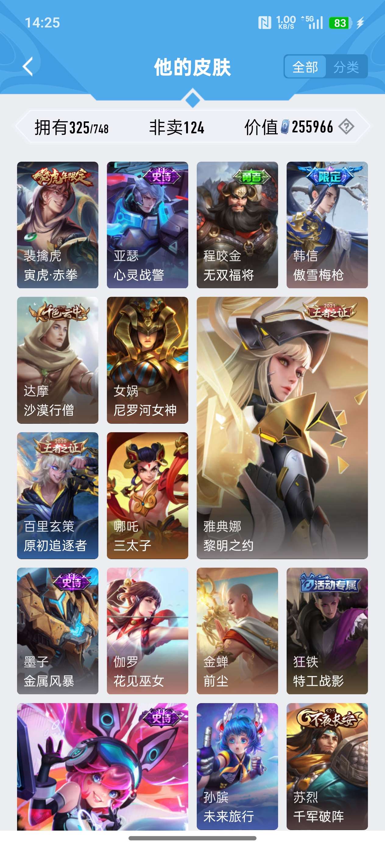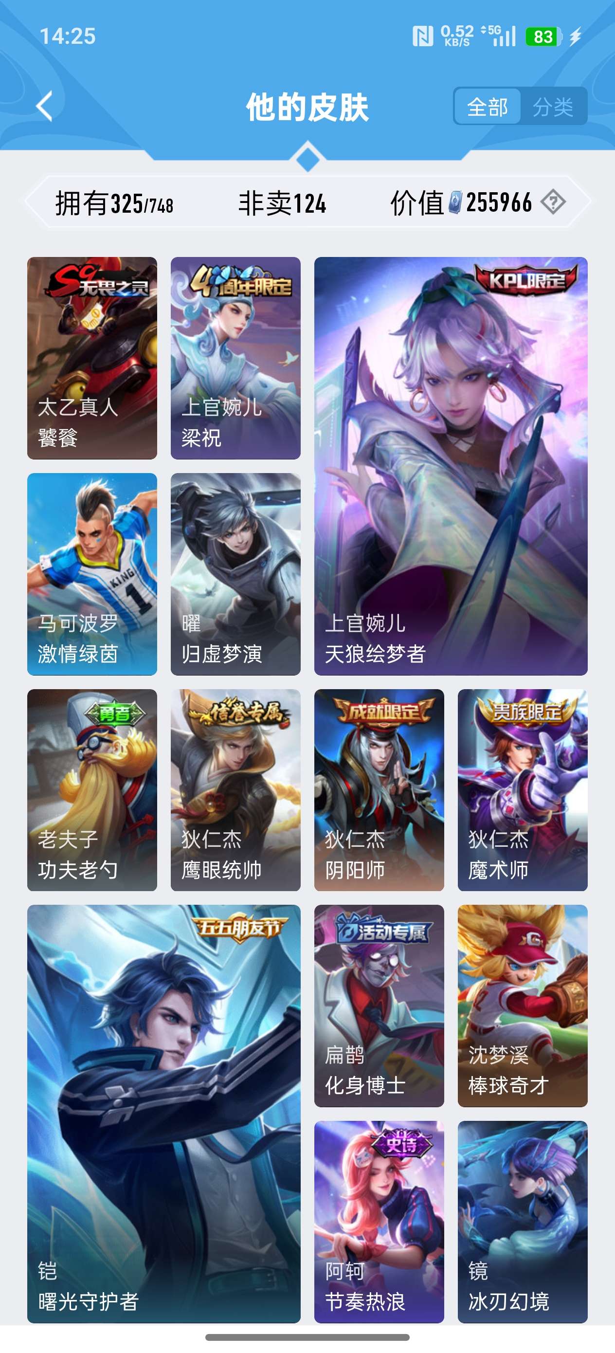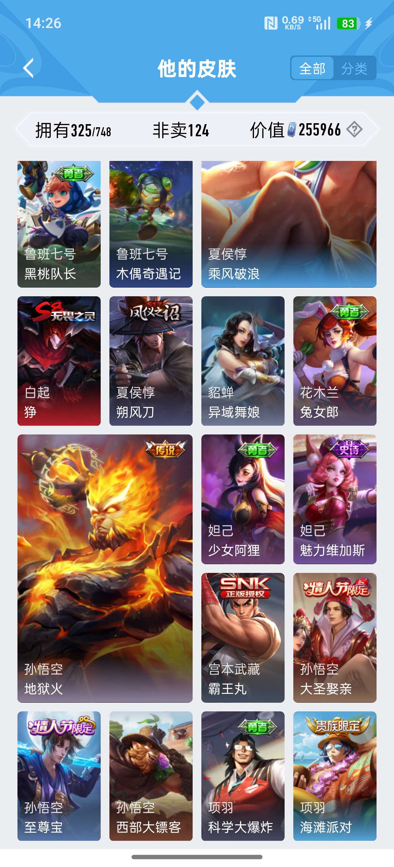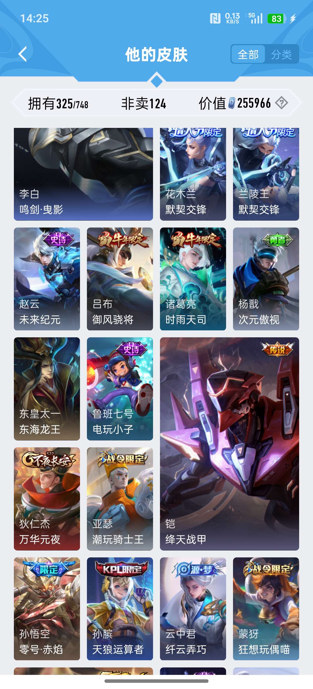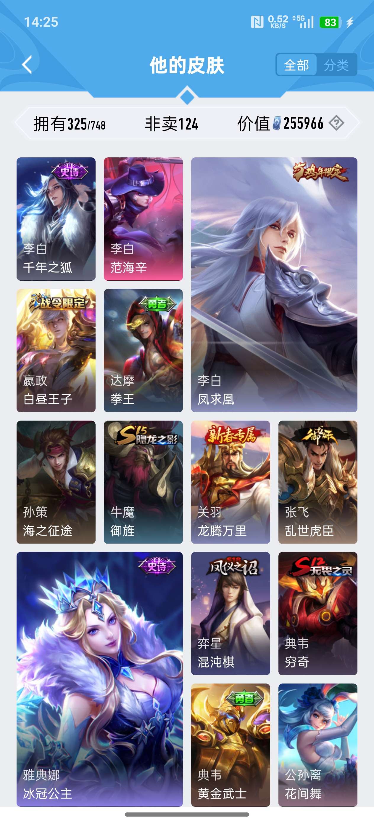 苹果QQ/非凡王者/325皮肤/126英雄/2典藏/0珍品无双/0无双/0珍品传说/16传说/99史
