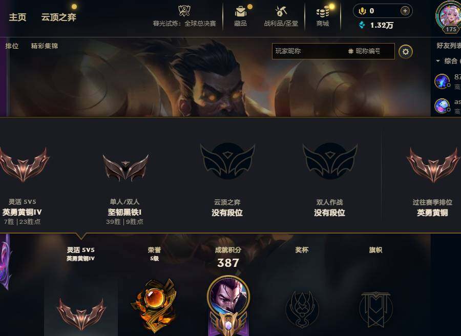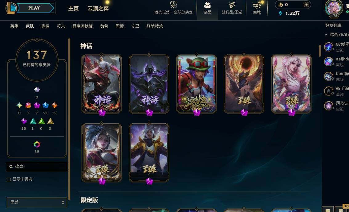 172英雄/137皮肤/1终极/7神话/21限定/10臻彩/47炫彩/12传说/19史诗/黑铁账号等级:175/