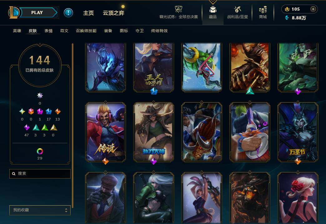 172英雄/144皮肤/1神话/17限定/30炫彩/13传说/47史诗/