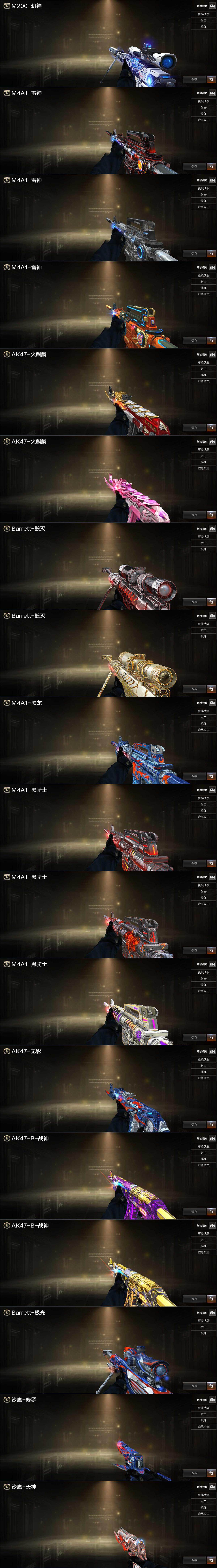 【热门武器】:QBZ03-金色蔷薇,HK417-朱雀,M4A1-青龙,M200-幻神*2,死亡之眼,C.A.T,毒蜂,M4A1-黑骑士*4,汤姆逊-烈龙*6,加特林-炼狱,沙鹰-修罗*3