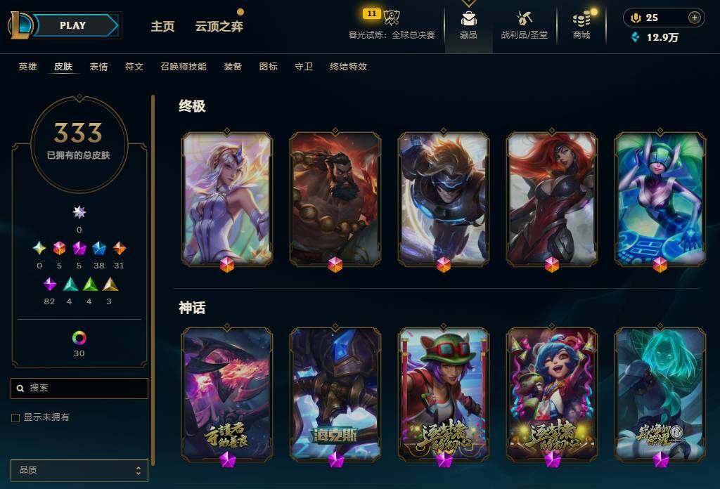 172英雄/333皮肤/5终极/5神话/38限定/4臻彩/34炫彩/31传说/82史诗/白银账号等级:417