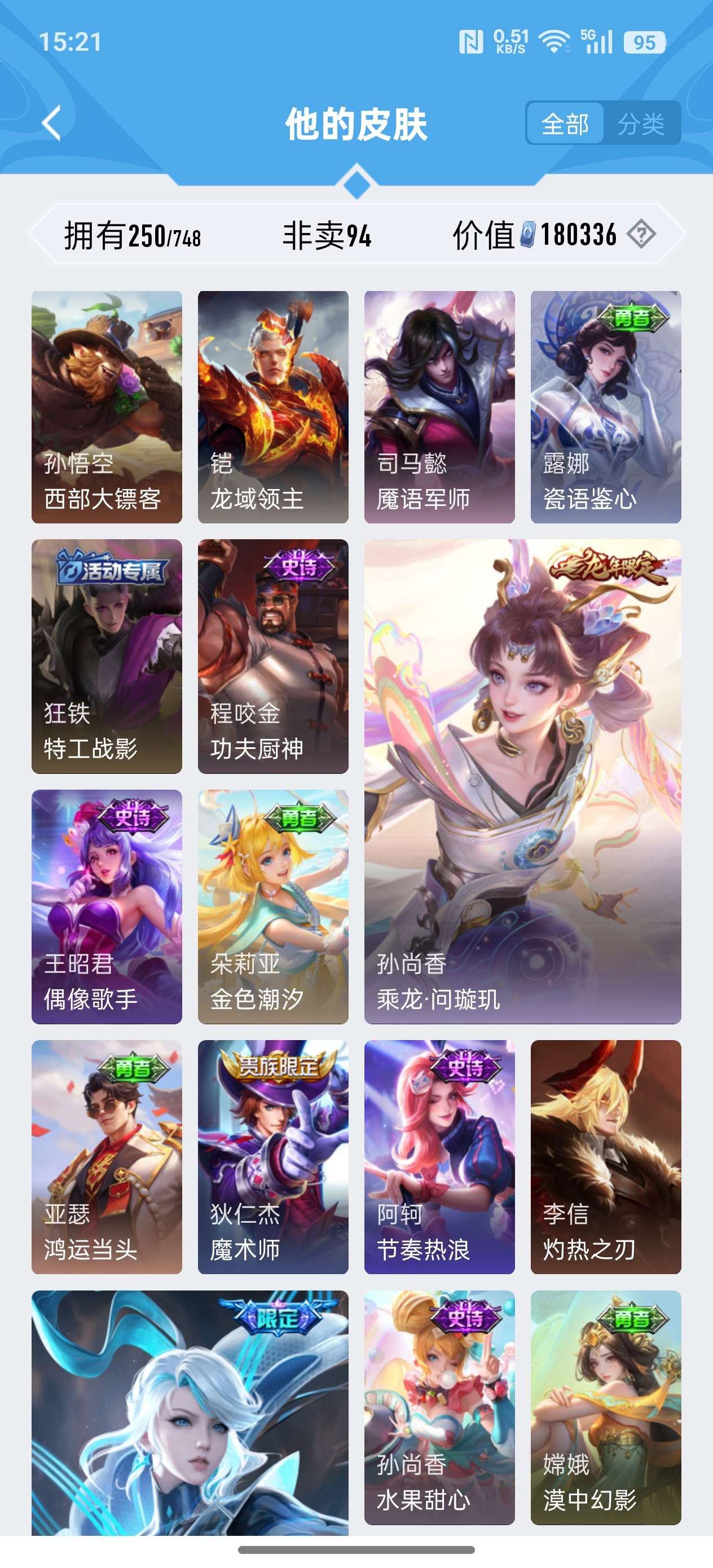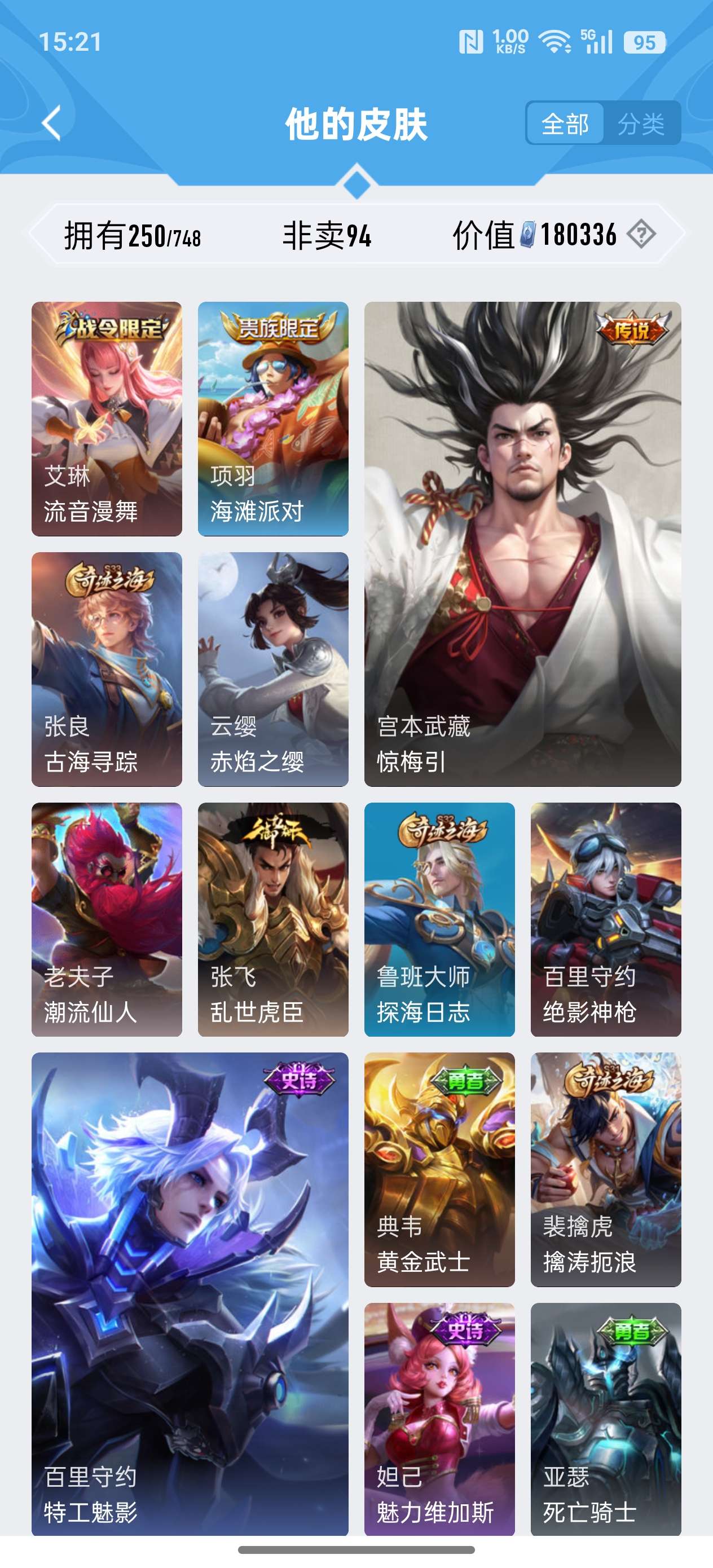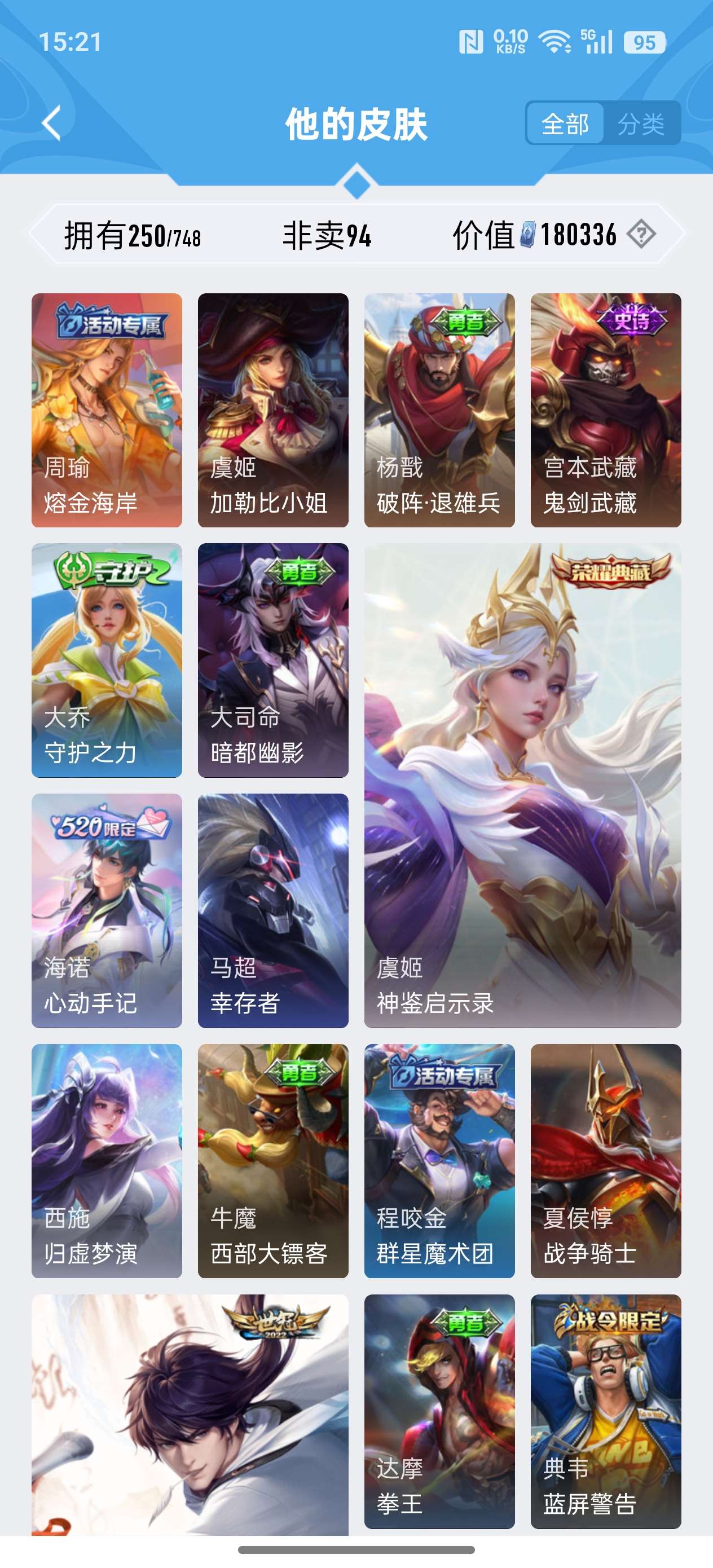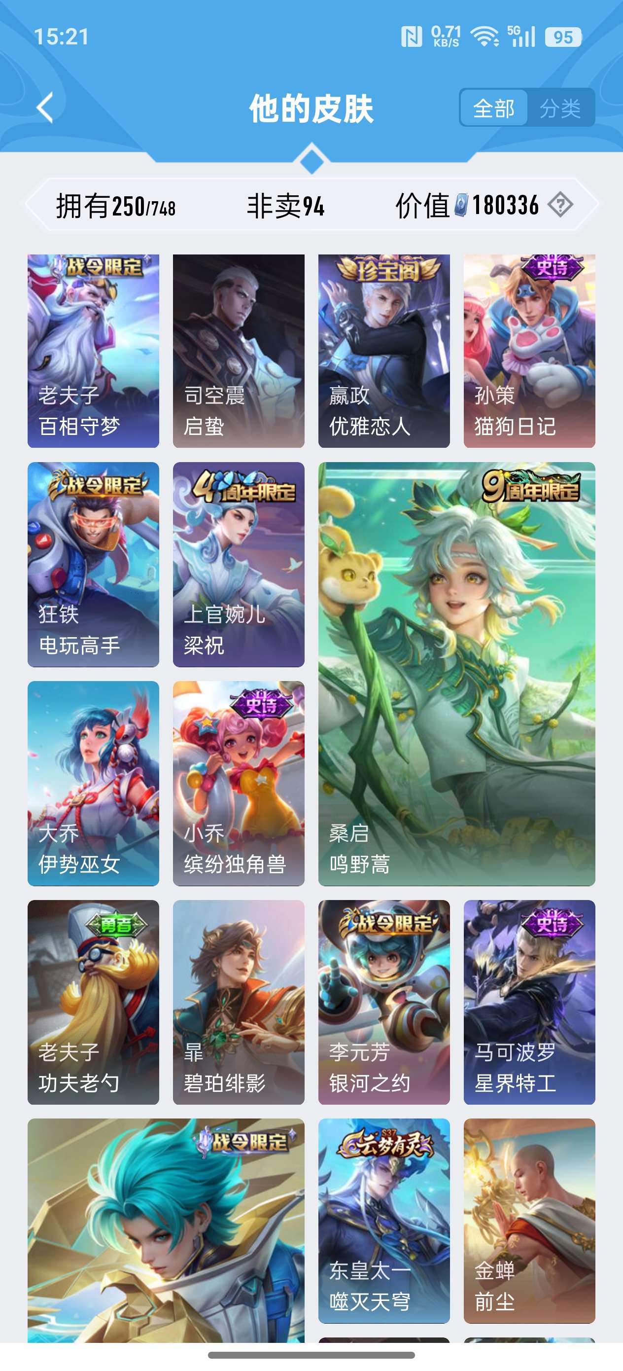 安卓QQ/绝世王者/250皮肤/128英雄/1典藏/0珍品无双/1无双/3珍品传说/14传说/67史