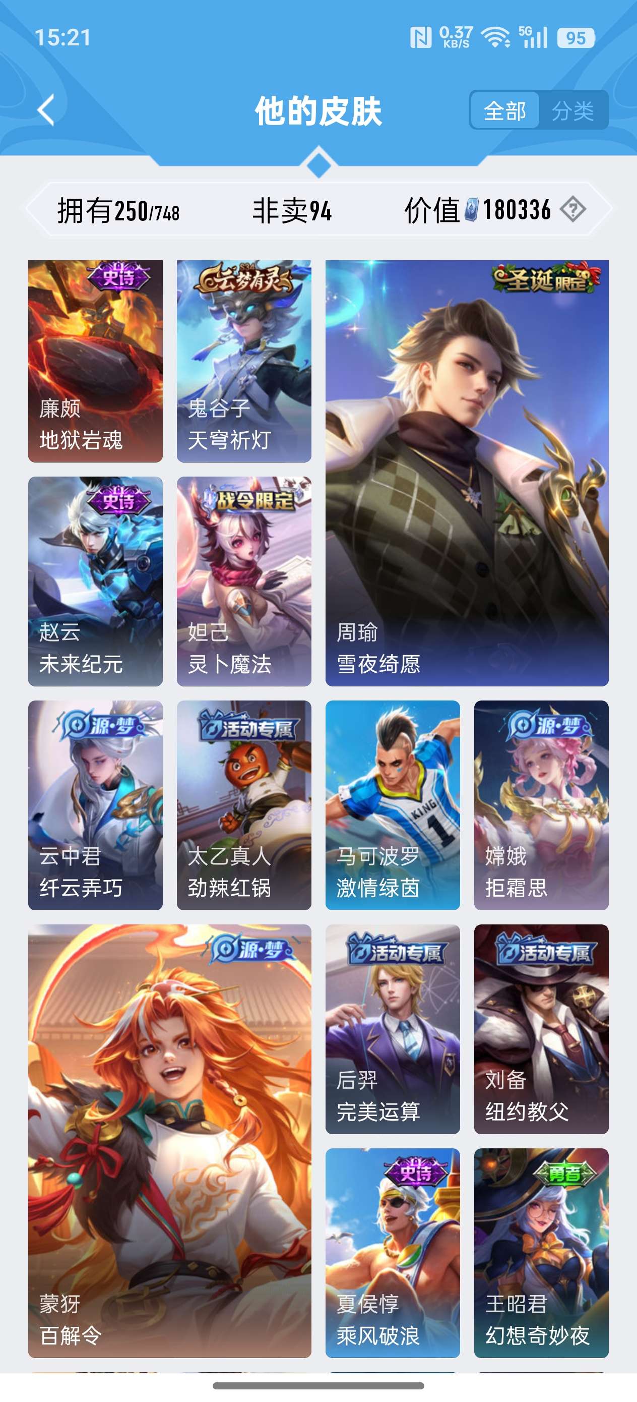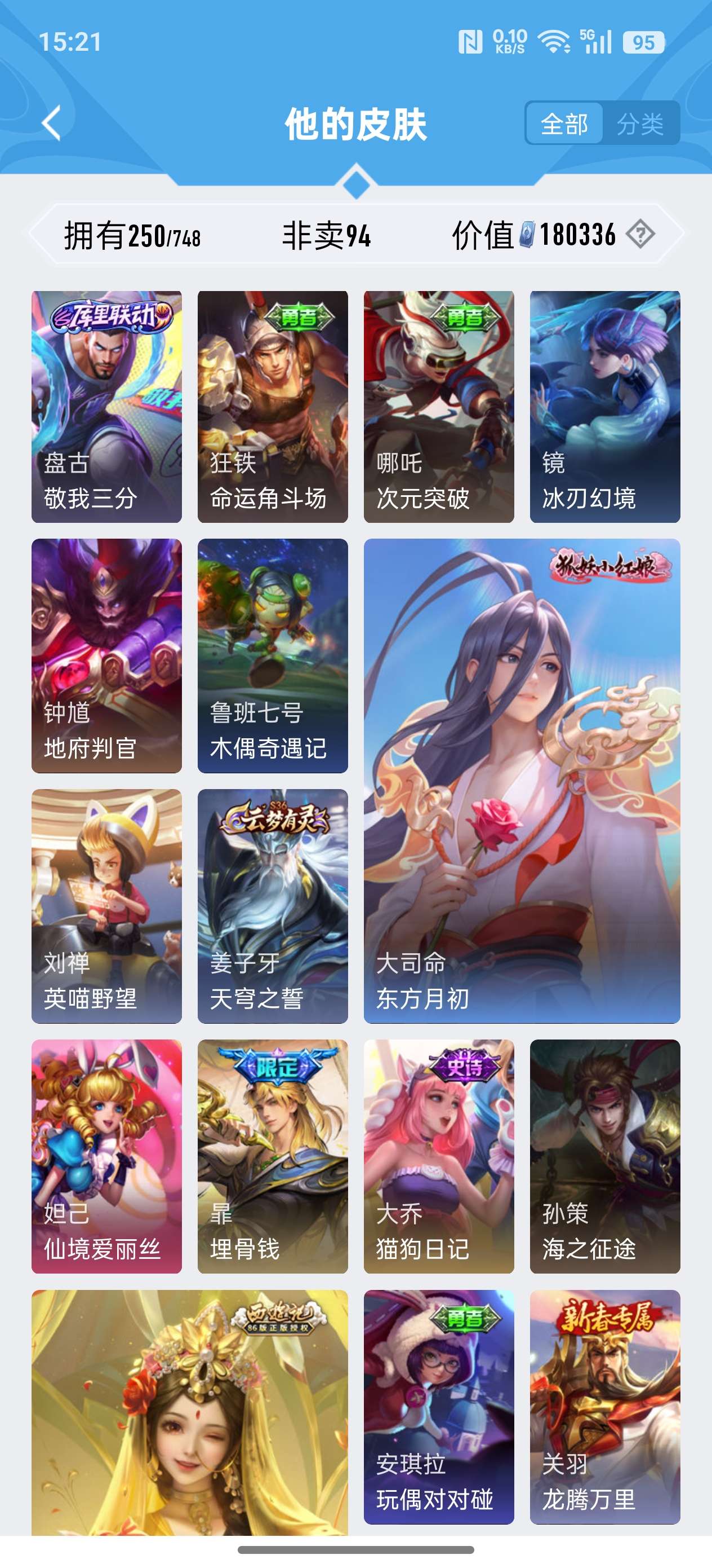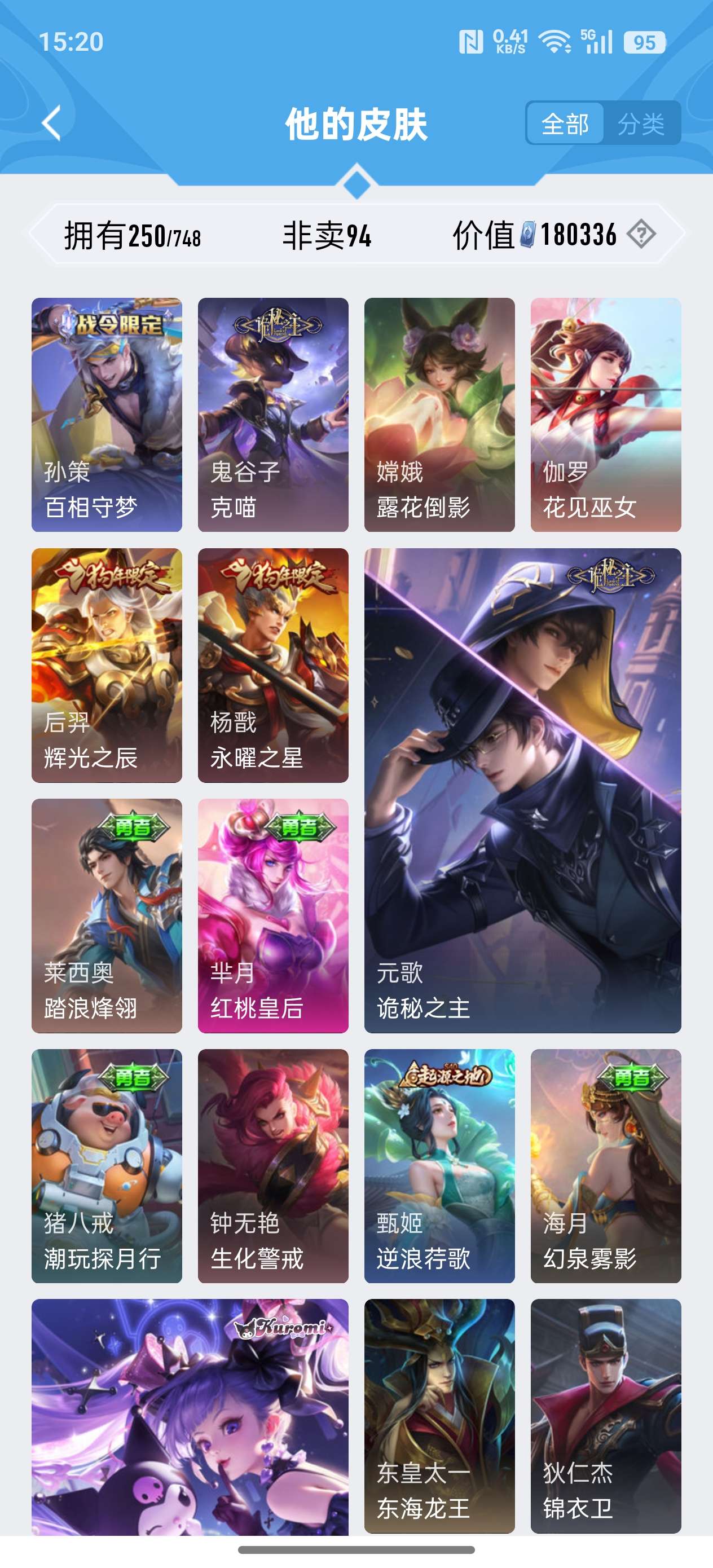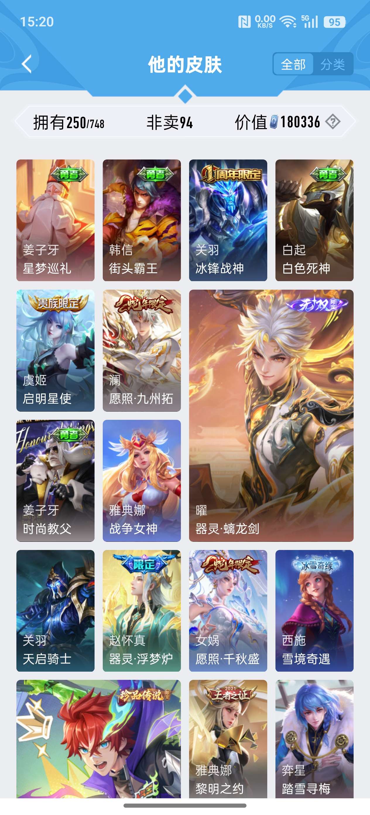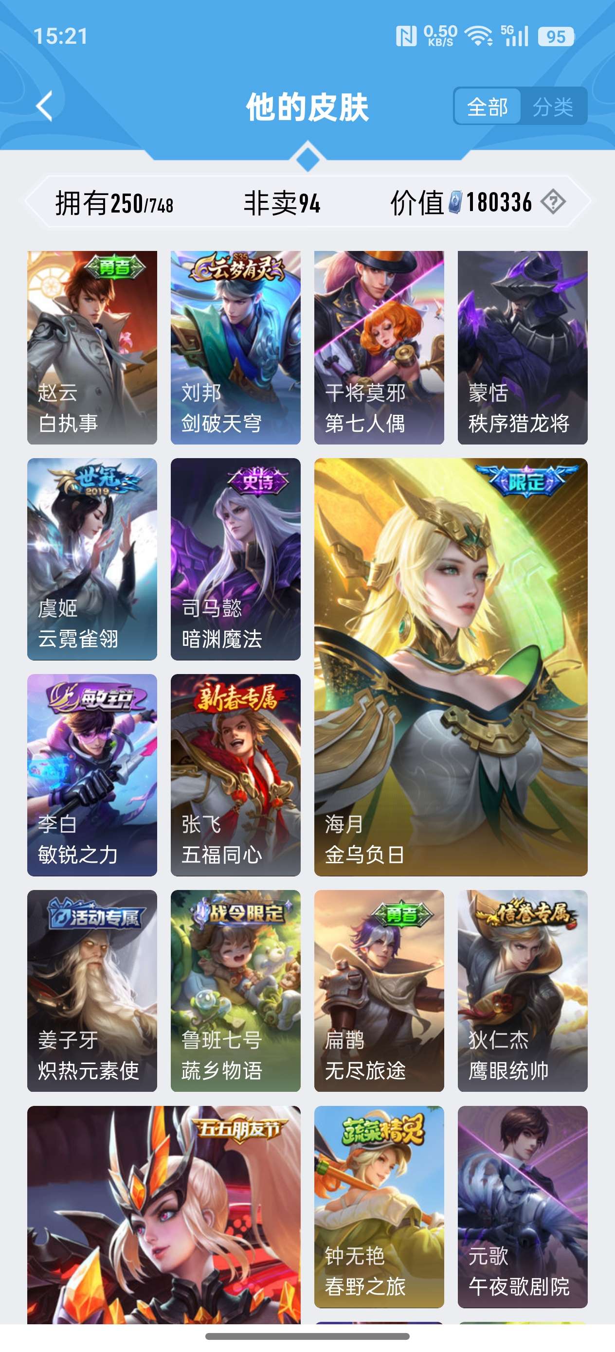 安卓QQ/绝世王者/250皮肤/128英雄/1典藏/0珍品无双/1无双/3珍品传说/14传说/67史