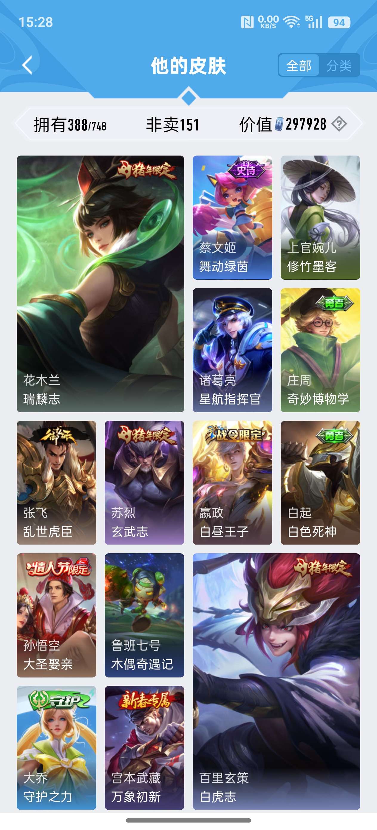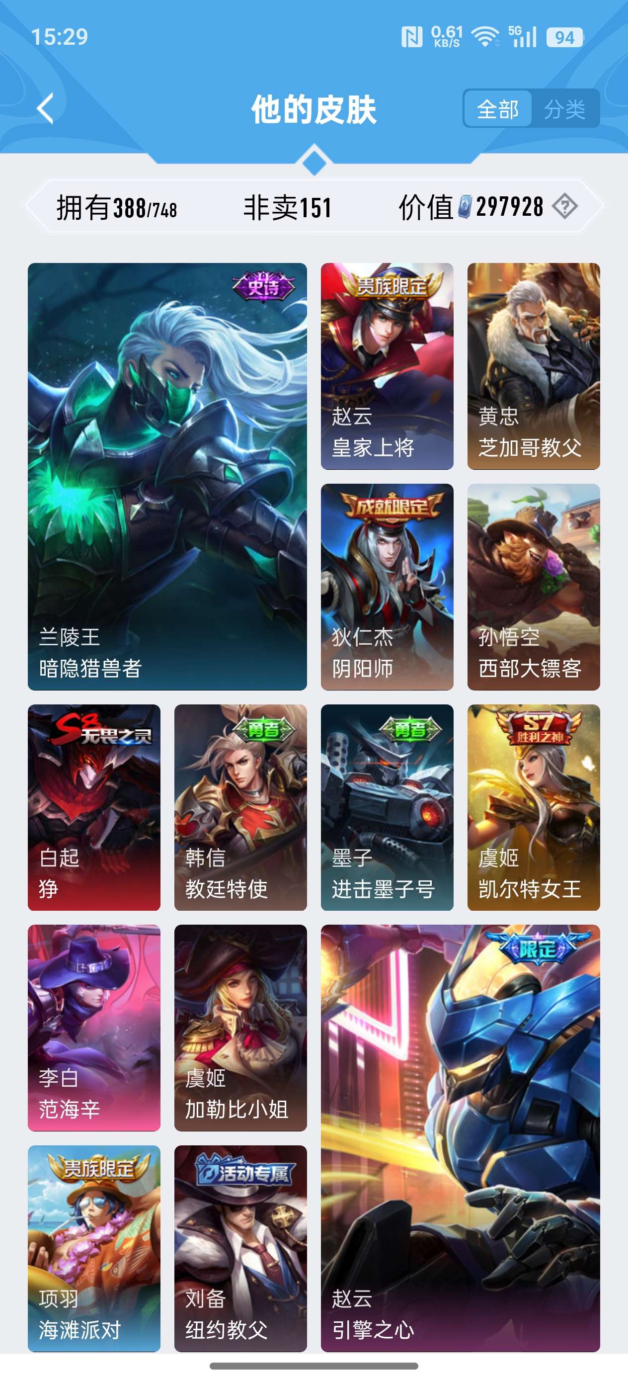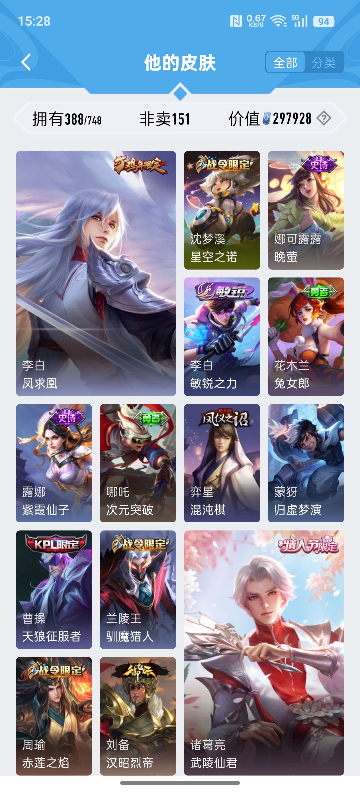 安卓QQ/至尊星耀/388皮肤/127英雄/2典藏/0珍品无双/0无双/2珍品传说/28传说/111