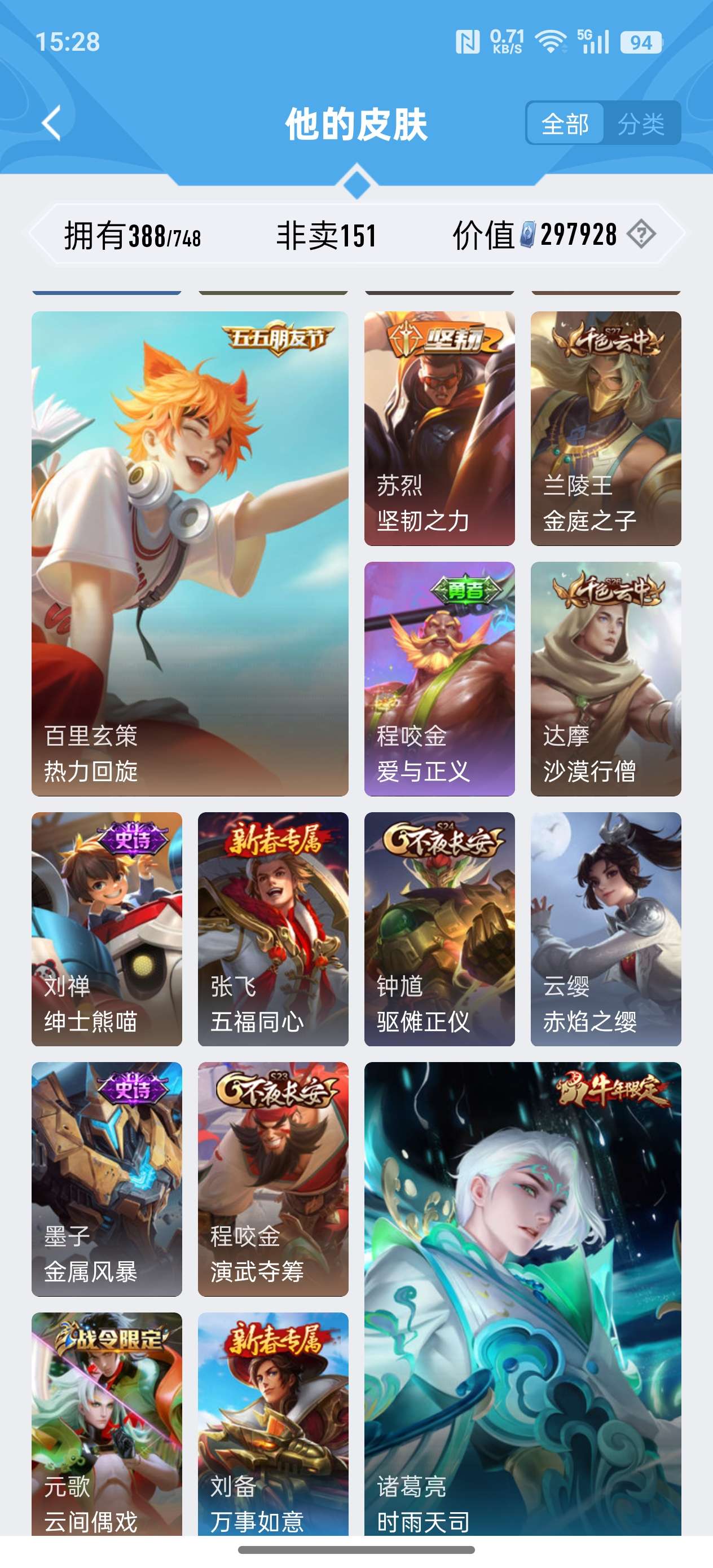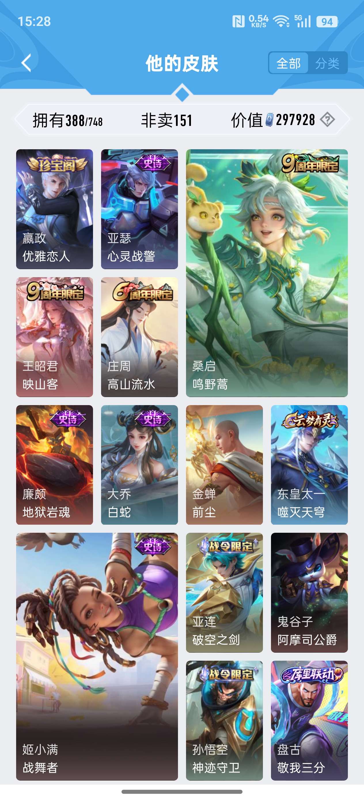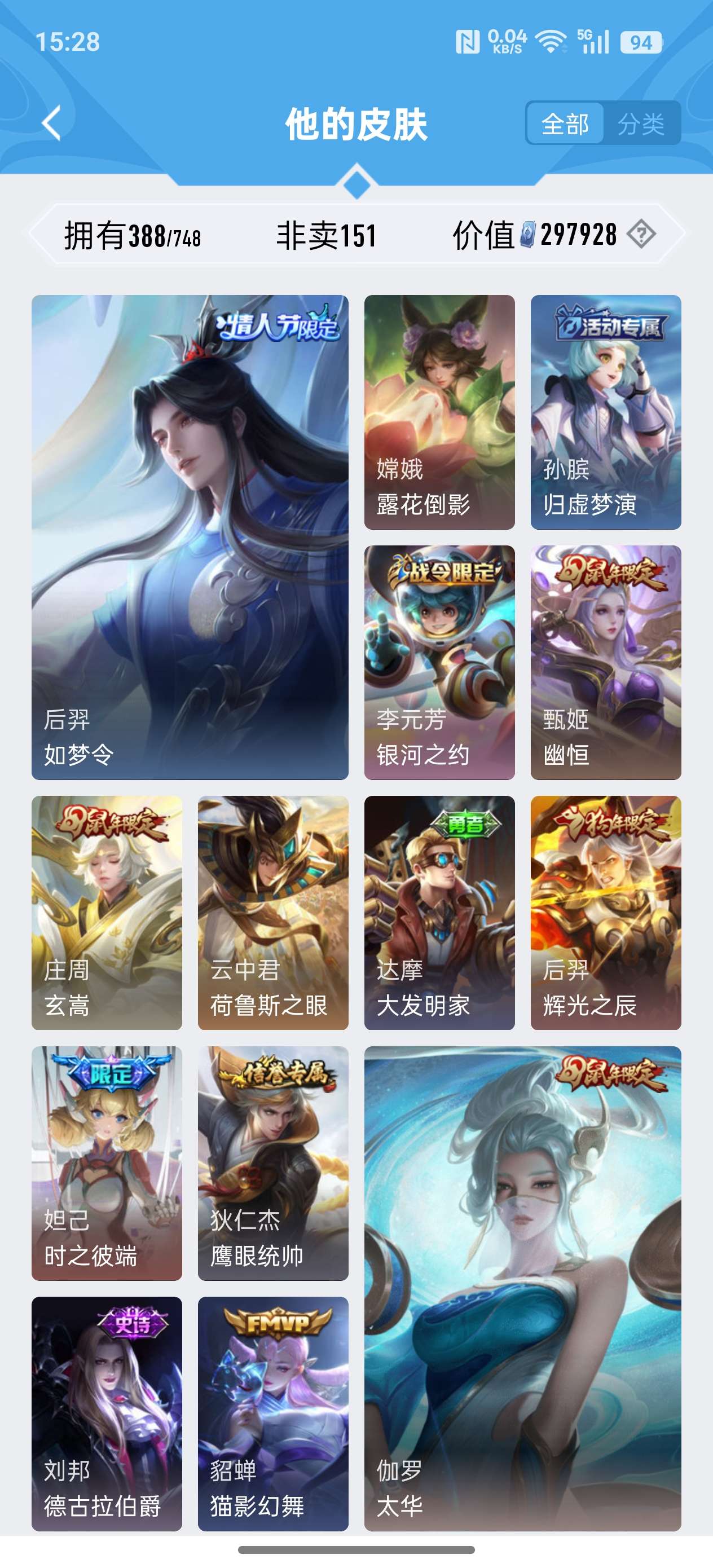 安卓QQ/至尊星耀/388皮肤/127英雄/2典藏/0珍品无双/0无双/2珍品传说/28传说/111