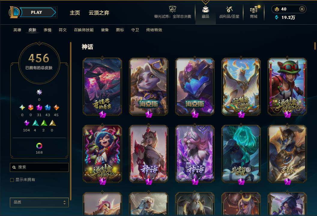 172英雄/456皮肤/31神话/43限定/10臻彩/249炫彩/45传说/104史诗/白银账号等级:655/