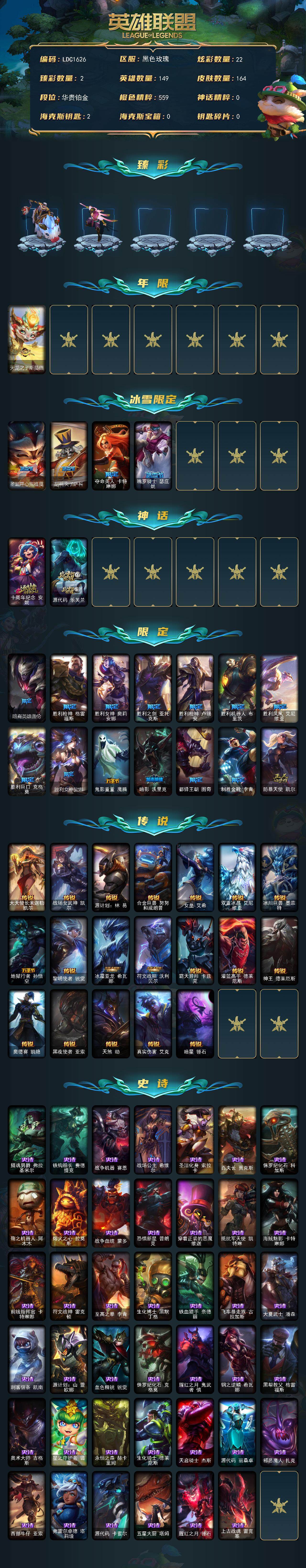 149英雄/164皮肤/2神话/19限定/2臻彩/22炫彩/19传说/41史诗/铂金/