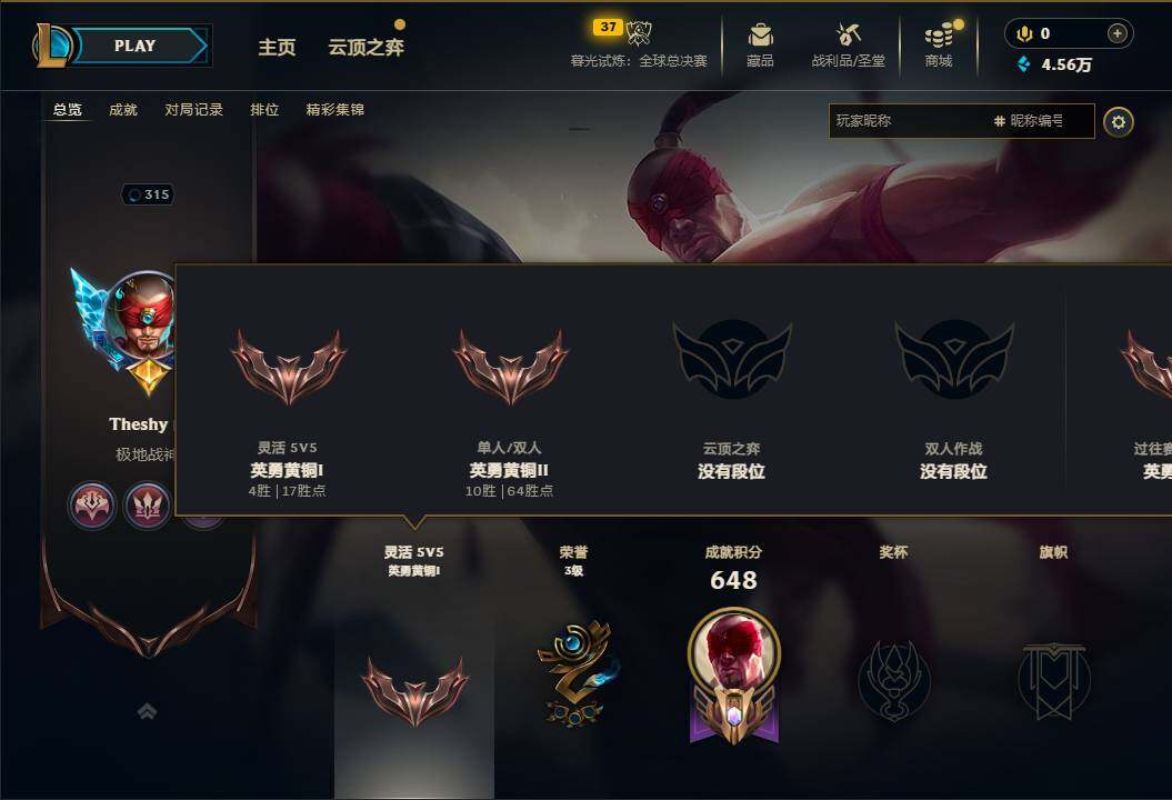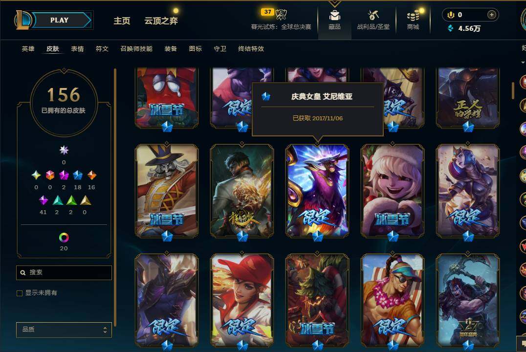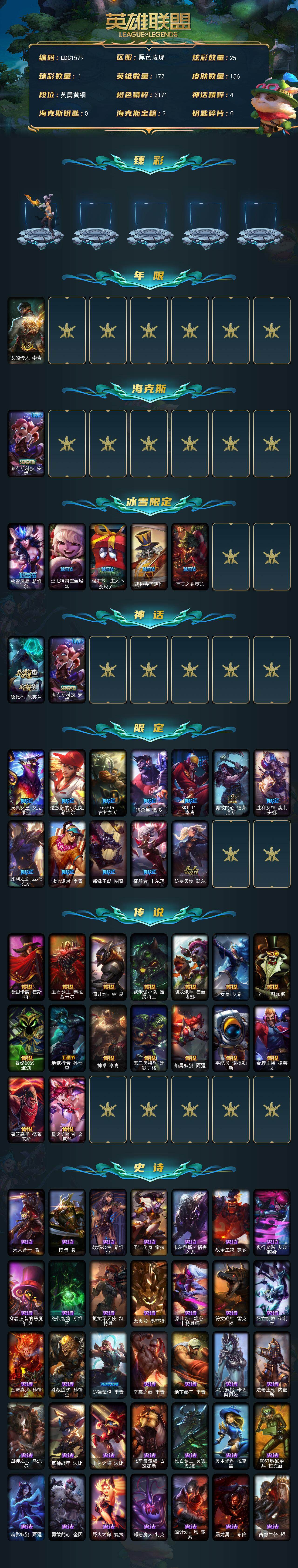 172英雄/156皮肤/2神话/18限定/1臻彩/25炫彩/16传说/41史诗/青铜账号等级:315/