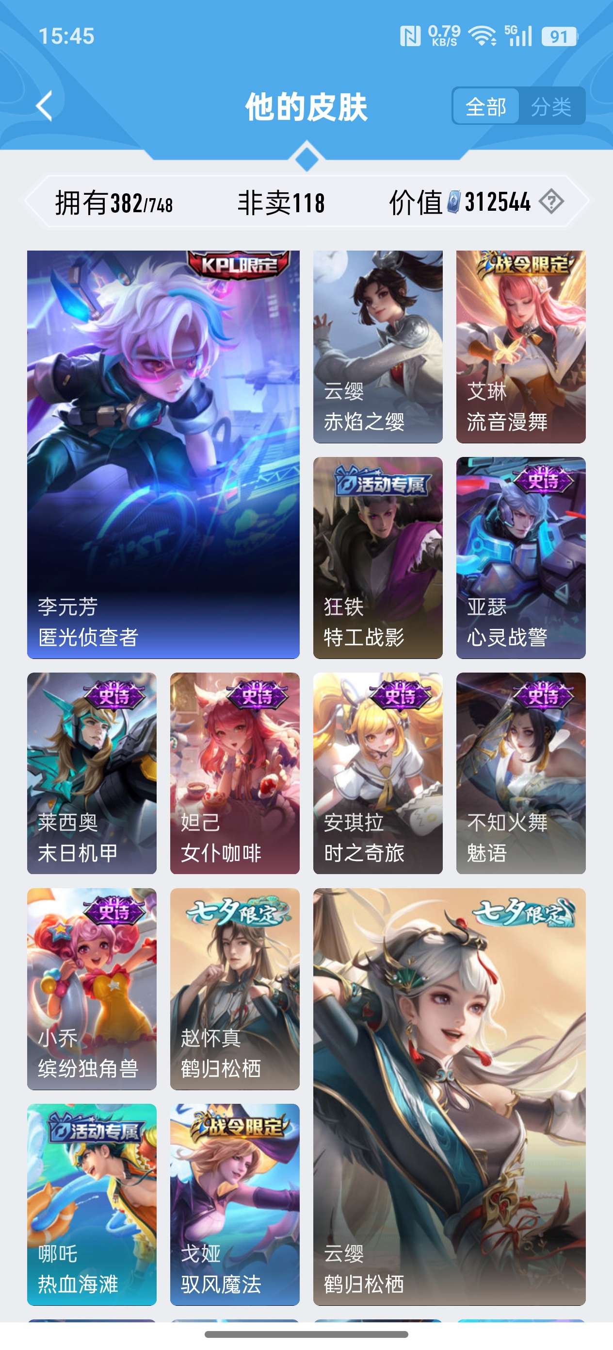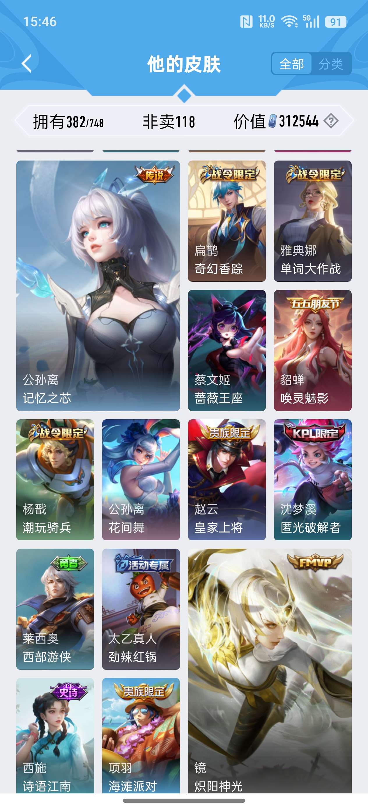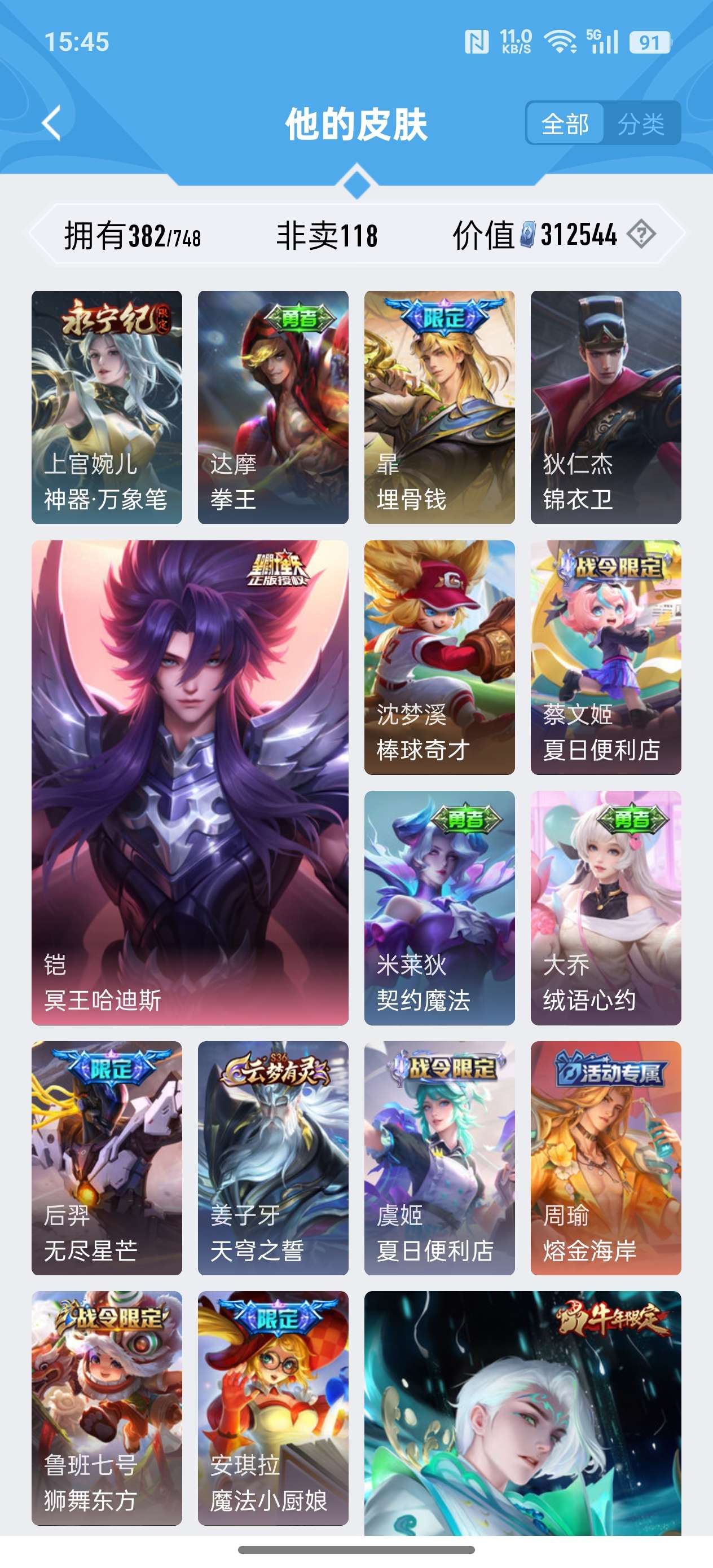 安卓QQ/荣耀黄金/382皮肤/127英雄/1典藏/0珍品无双/0无双/8珍品传说/47传说/130