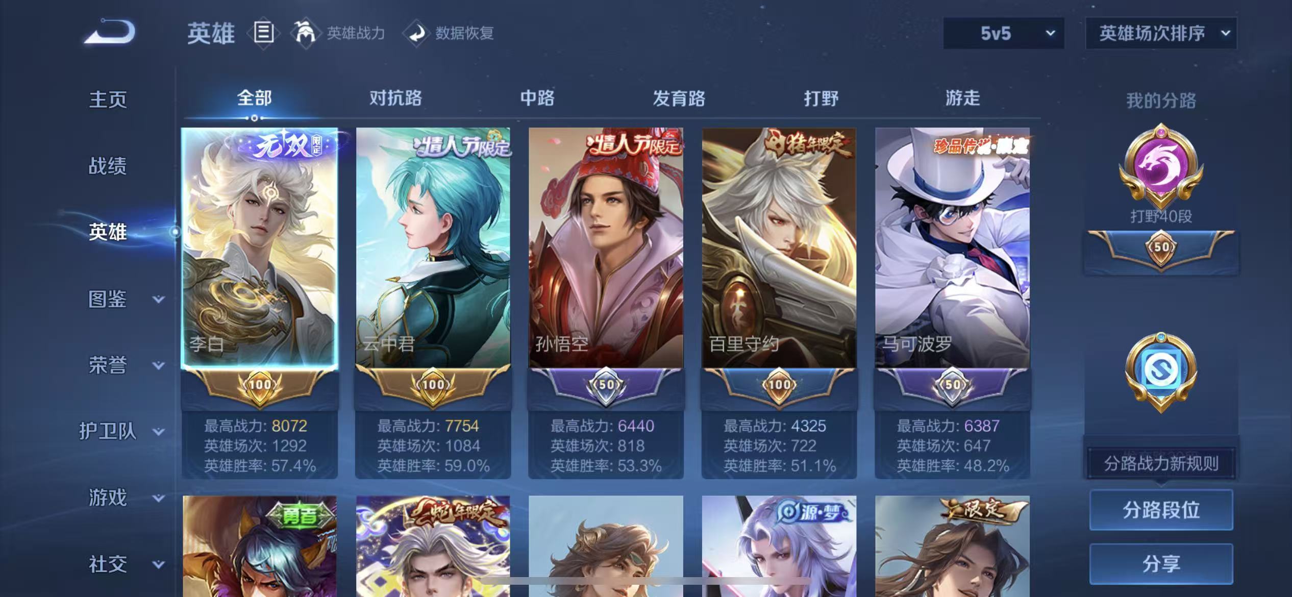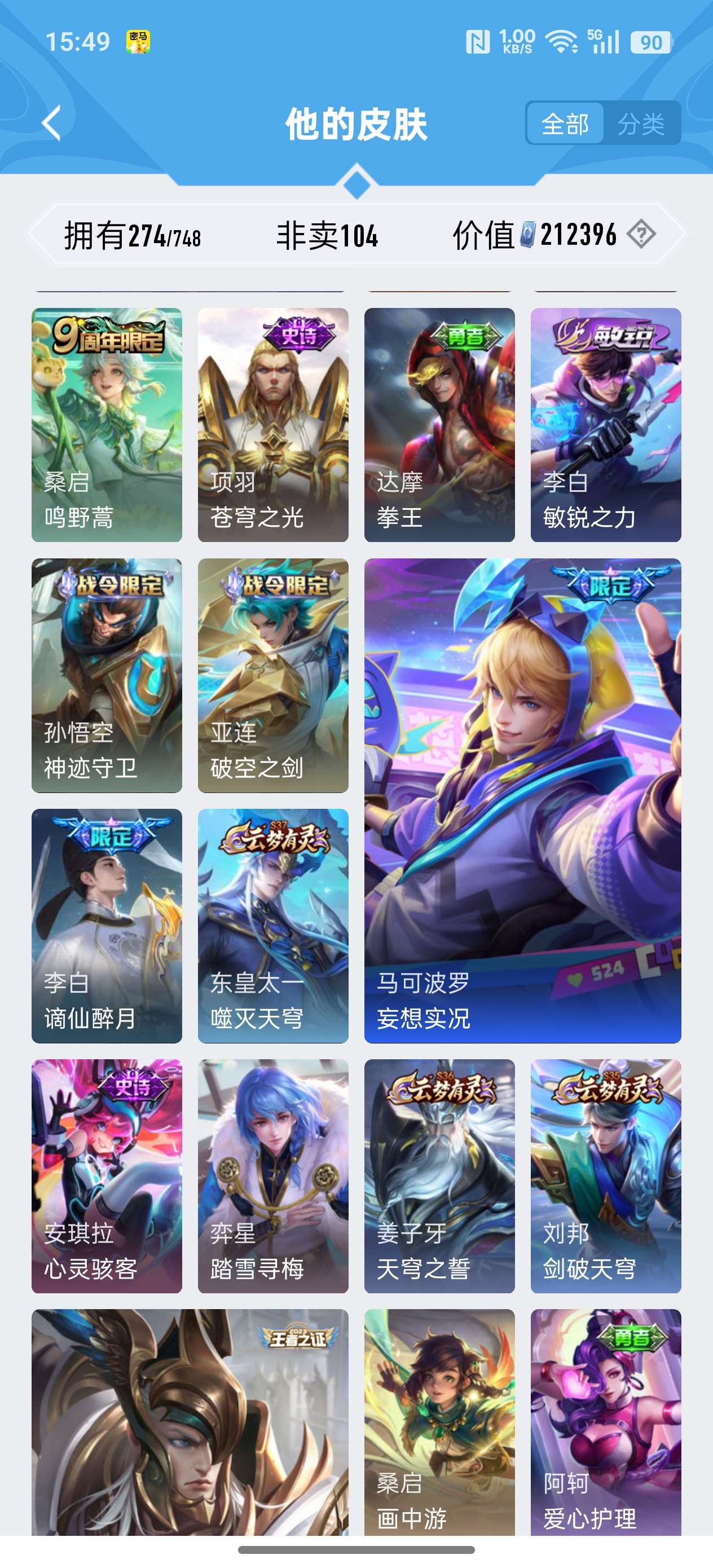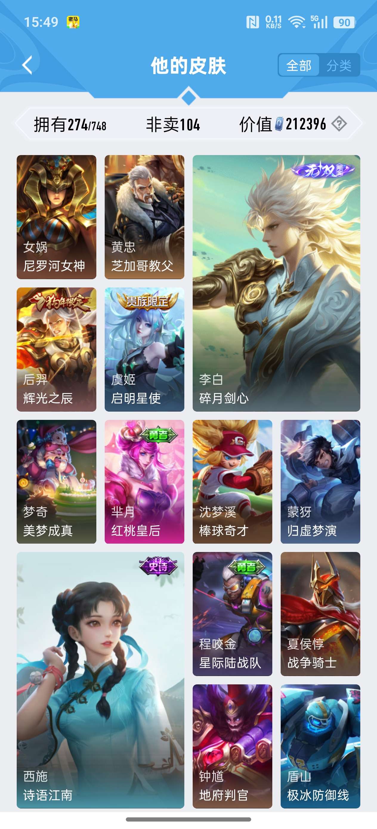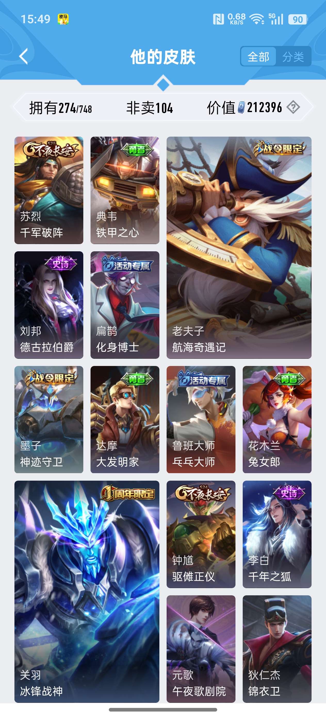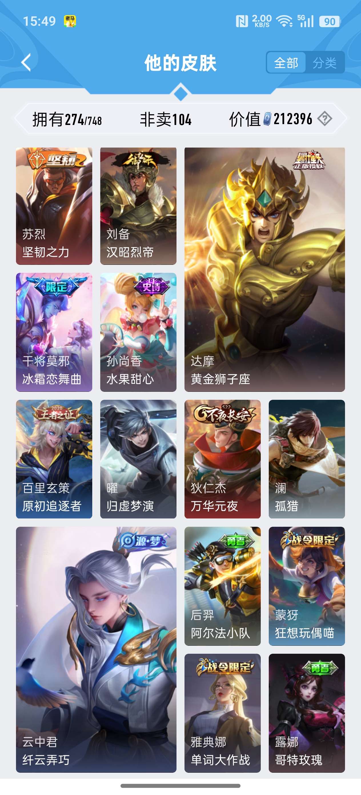 苹果QQ/荣耀王者/274皮肤/127英雄/1典藏/0珍品无双/1无双/1珍品传说/16传说/90史