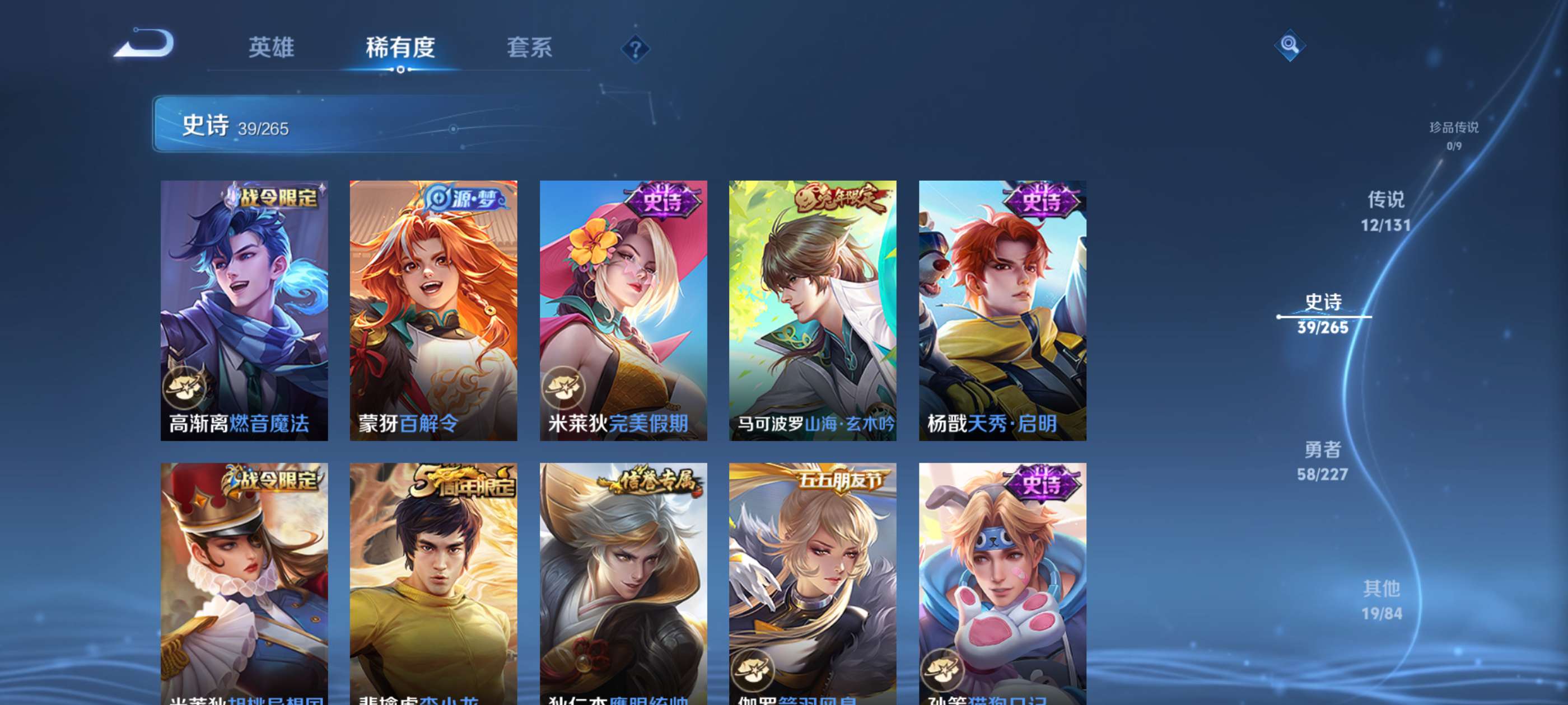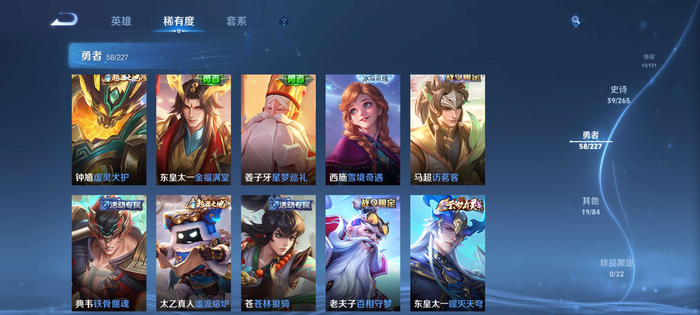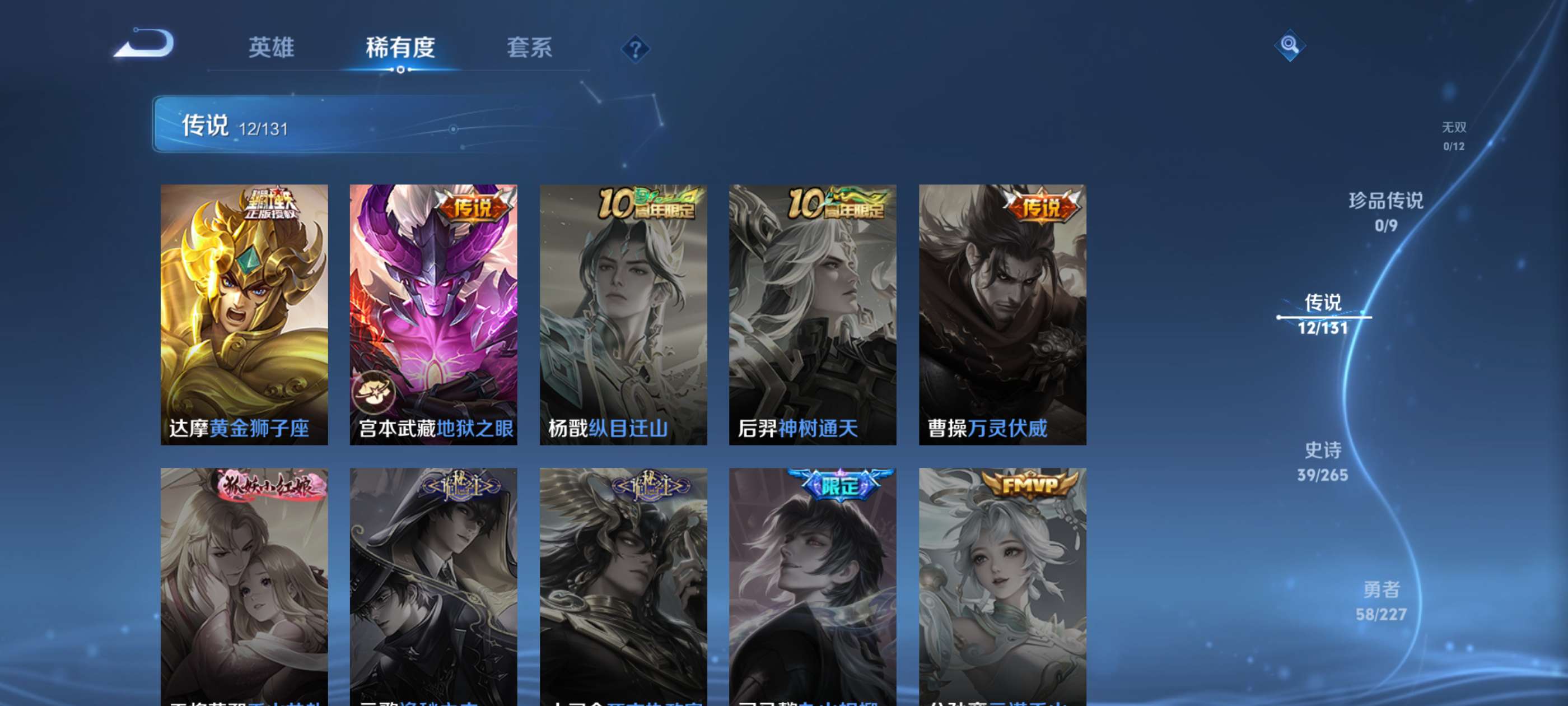 皮肤129 英雄125 非凡王者 荣耀典藏1 传说12 其他皮肤47-极品号 一典藏,十二传说(韩信典藏)