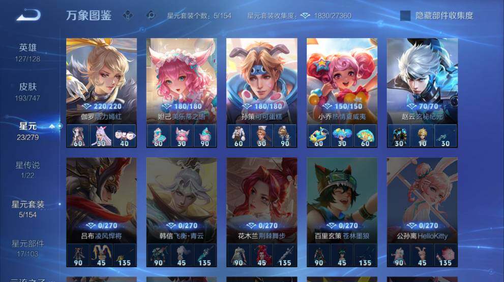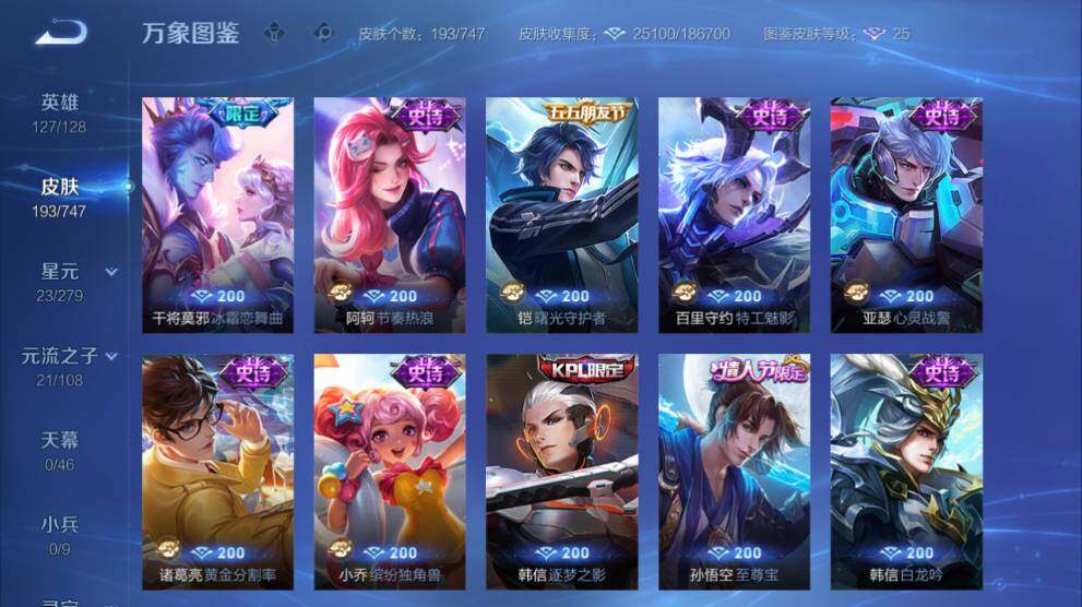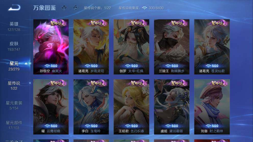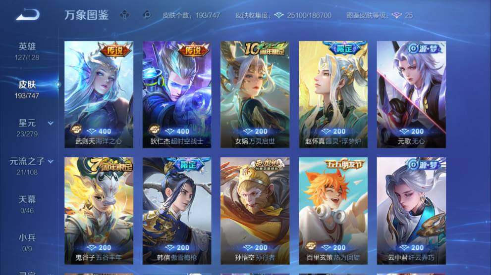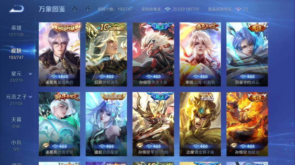 安卓Q-V8-193皮肤-1典藏皮肤-1典藏英雄-11传说-38史诗-1星传说