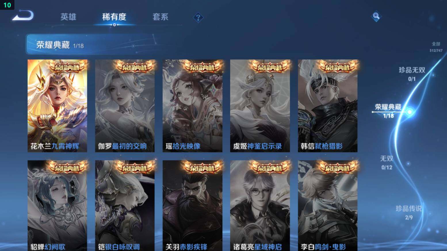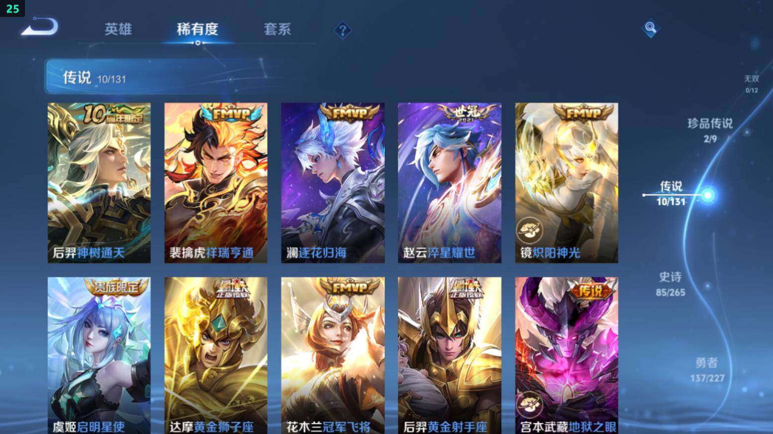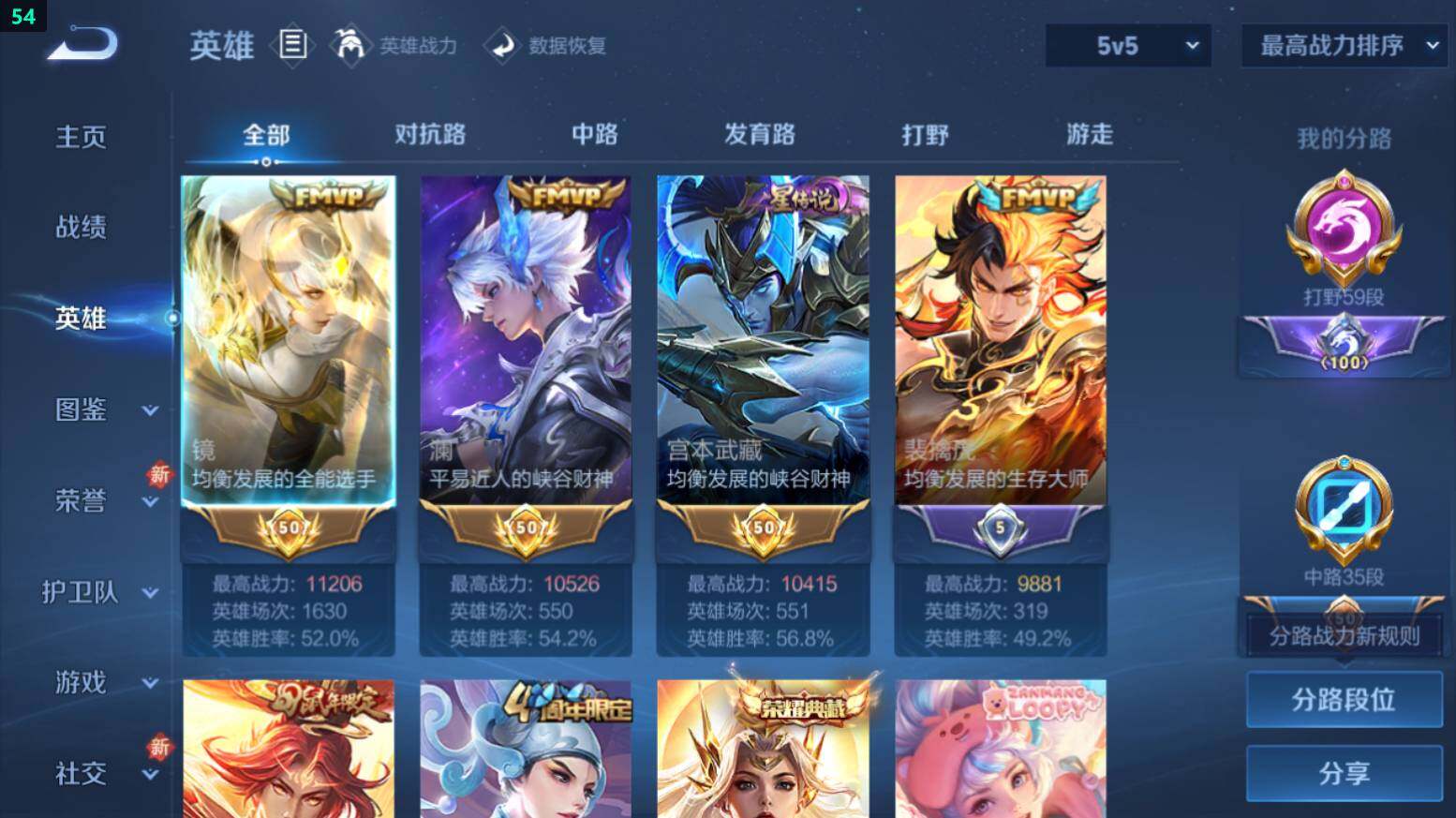 打野59段-9金标-万战澜/镜/宫本-3星传说-7按键苹果Q-V8-312皮肤-1典藏皮肤-2珍品传说-10传说-85史诗-2970星币