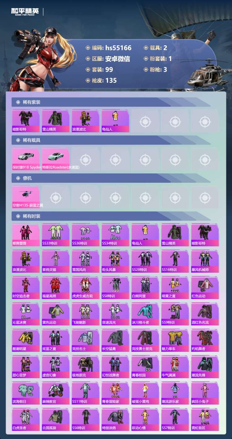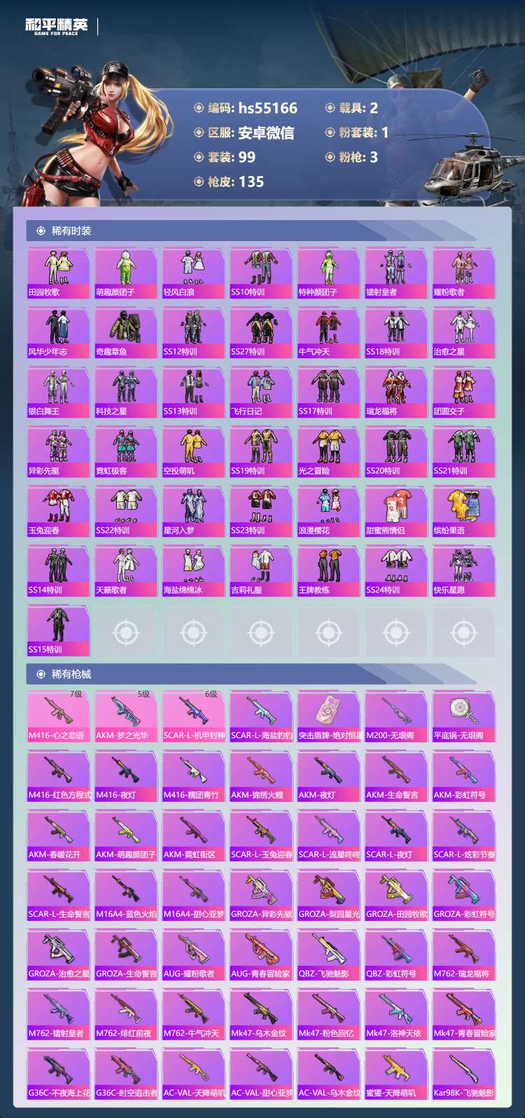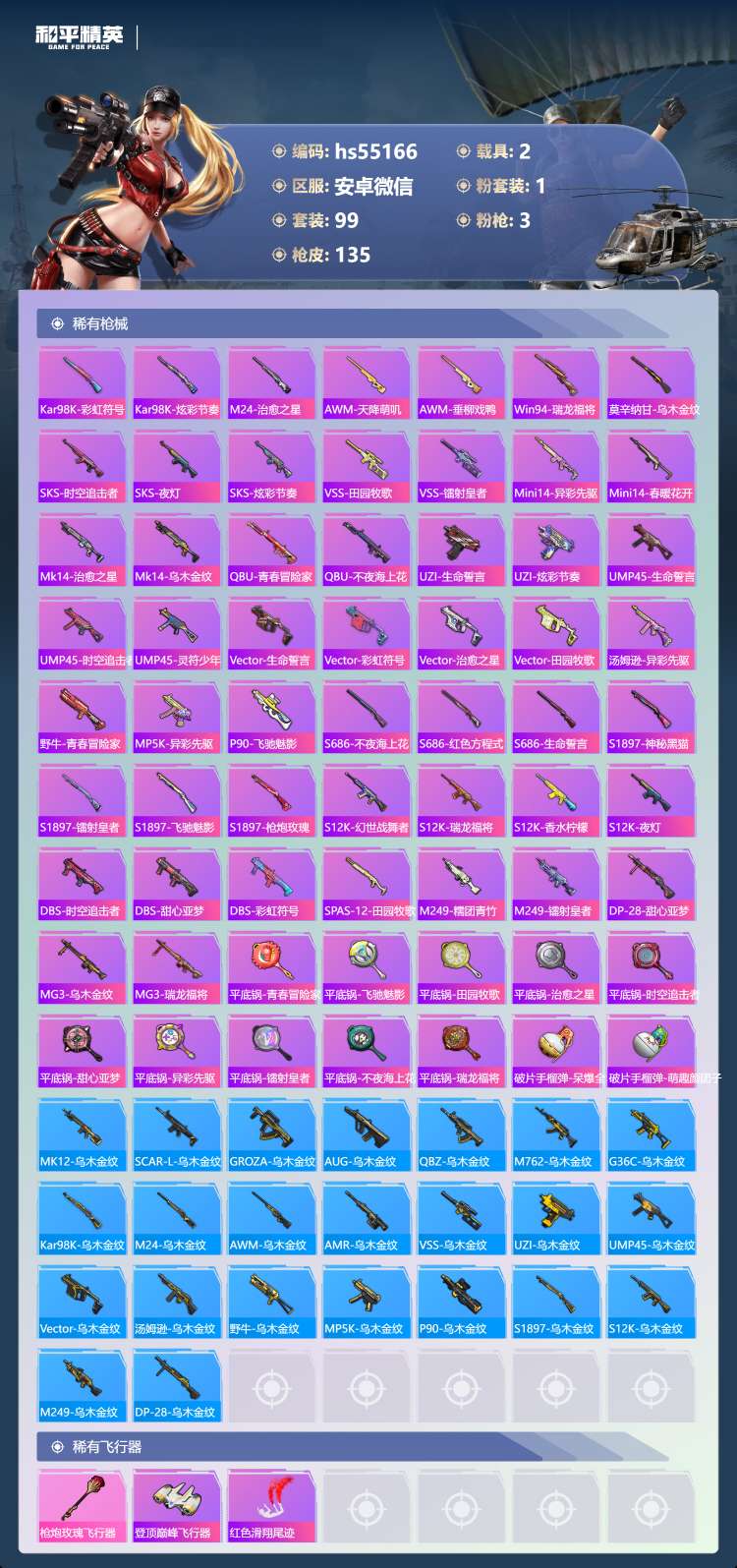 hs55166 安卓v-10王牌印记-1粉装-3特效枪-2载具-46746热力值-99套装-135