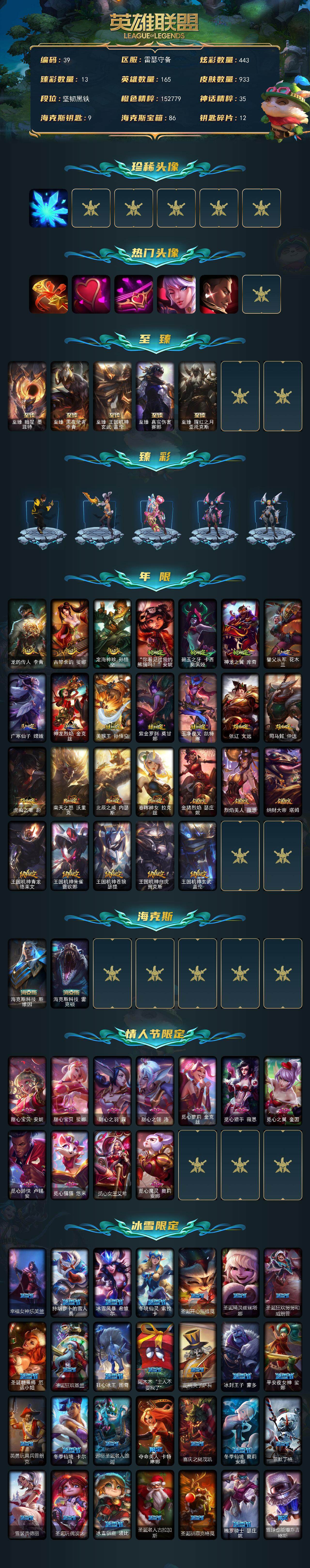 【5至臻 龙的传人至臻腥红之月亚托克斯】未定级段位-165英雄-933皮肤-443炫彩-5终极-9神话-196限定-83传说-215史诗