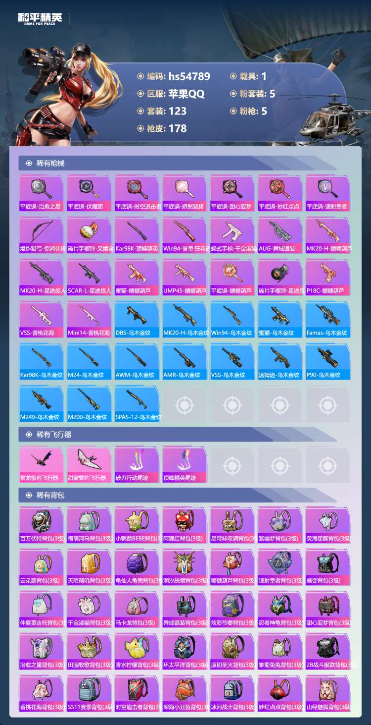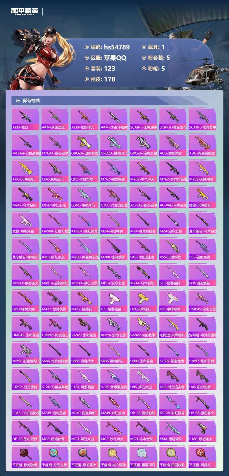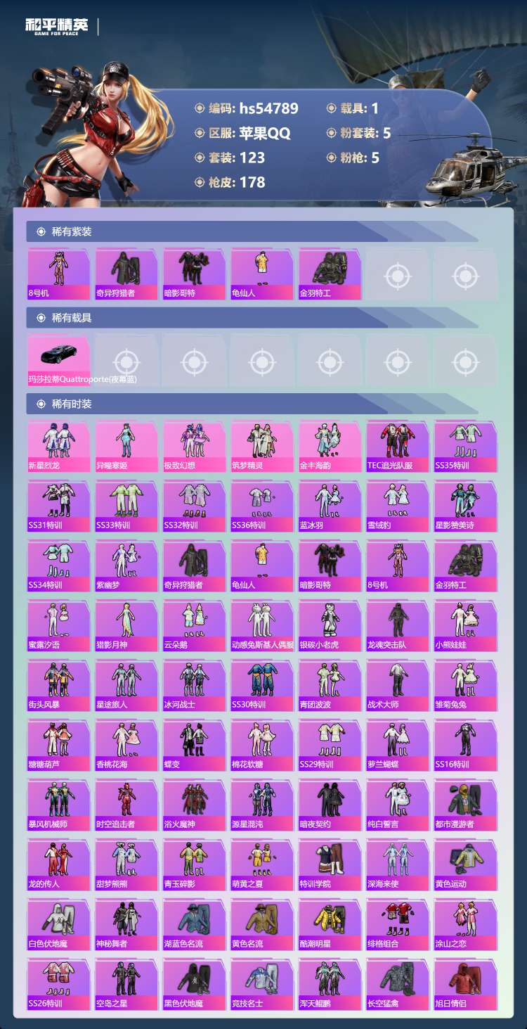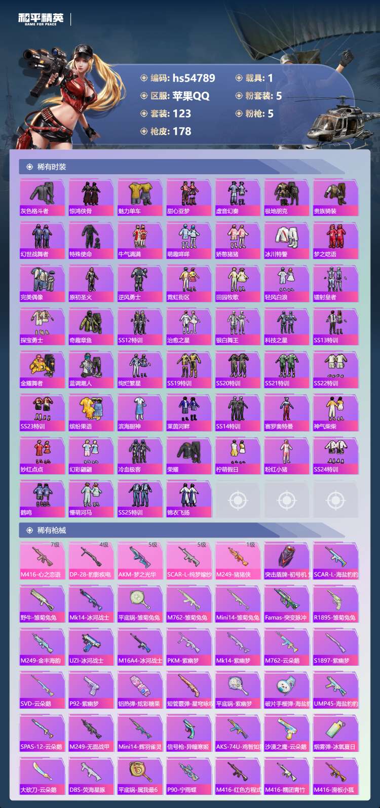 hs54789 苹果手Q-10王牌印记-5粉装-5特效枪-1载具-57246热力值-123套装-17