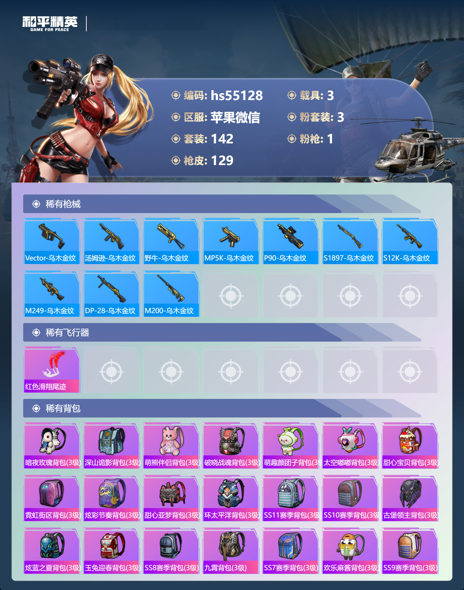 hs55128 苹果v-11王牌印记-有战神框-3粉装-1特效枪-3载具-44509热力值-142