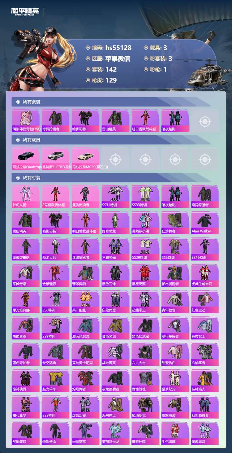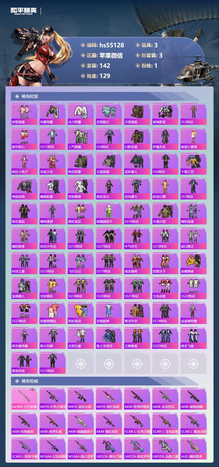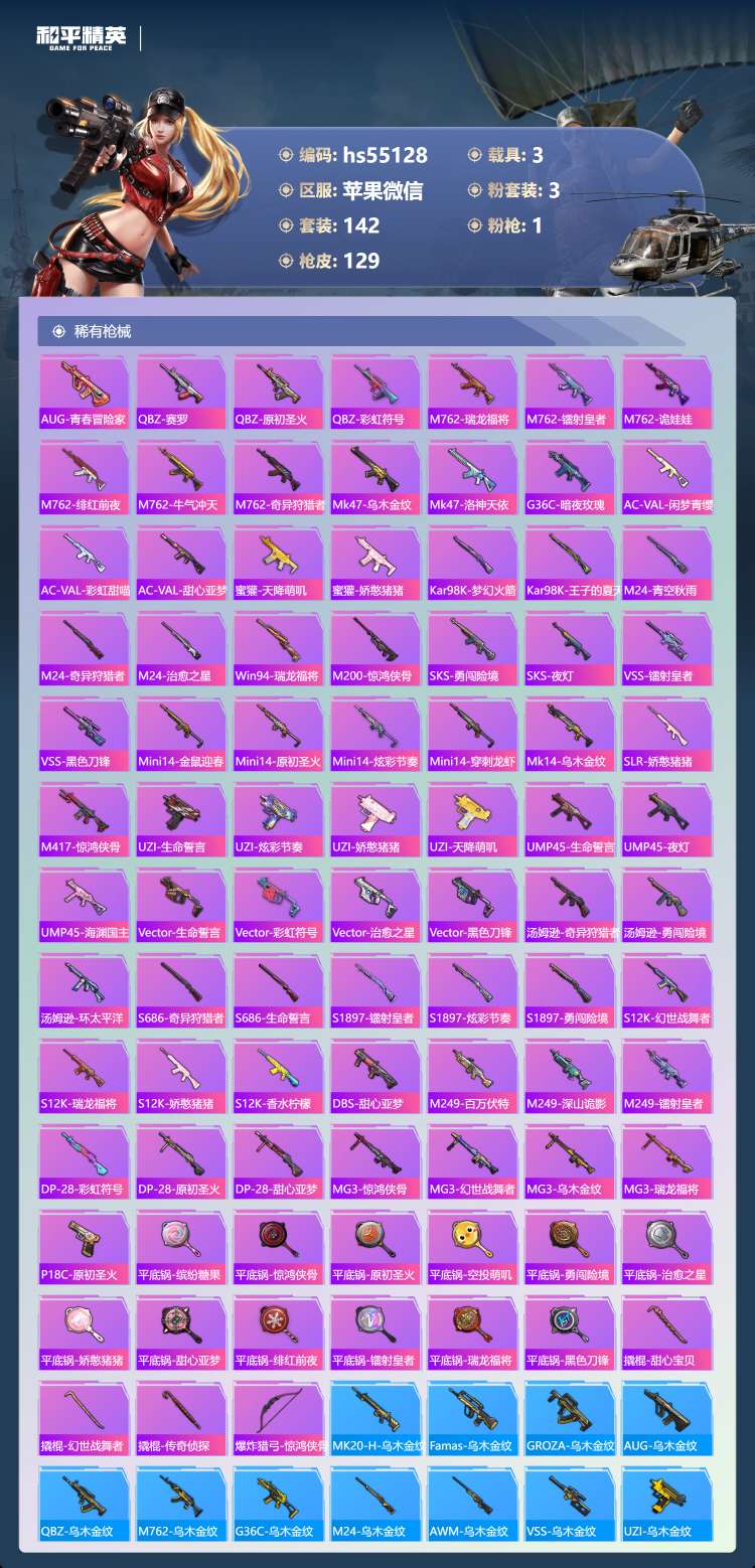 hs55128 苹果微-11王牌印记-有战神框-3粉装-1特效枪-3载具-44509热力值-142
