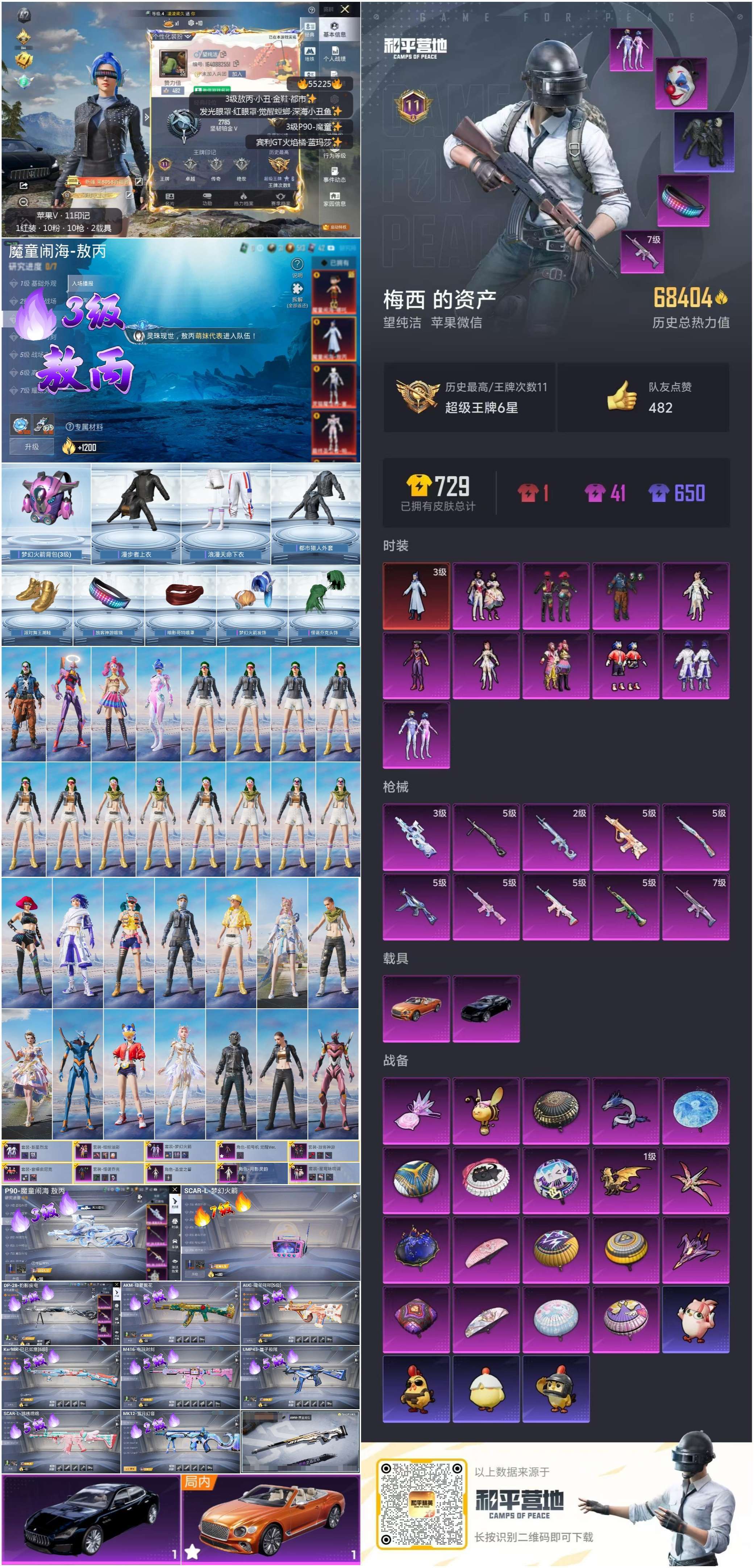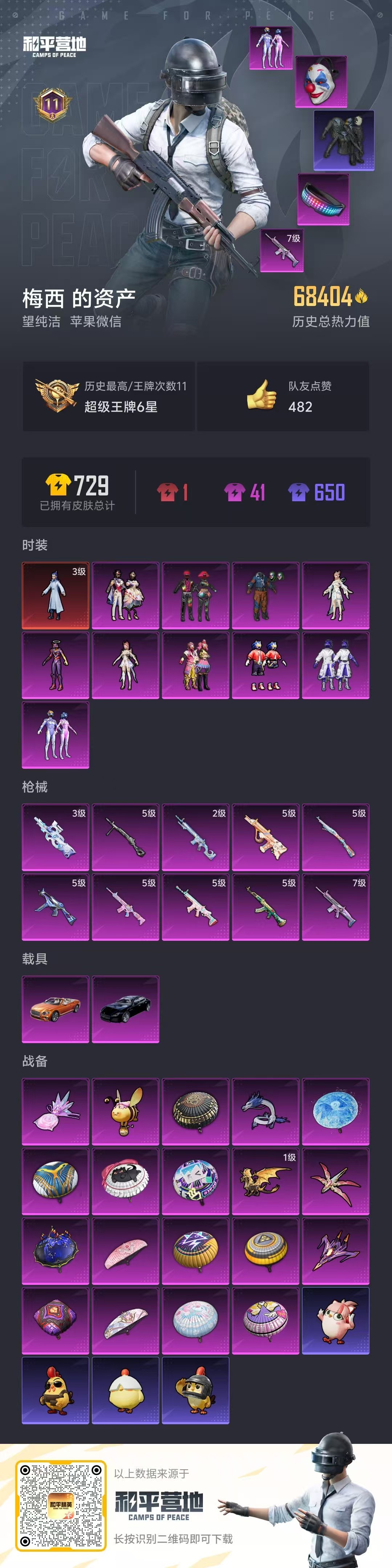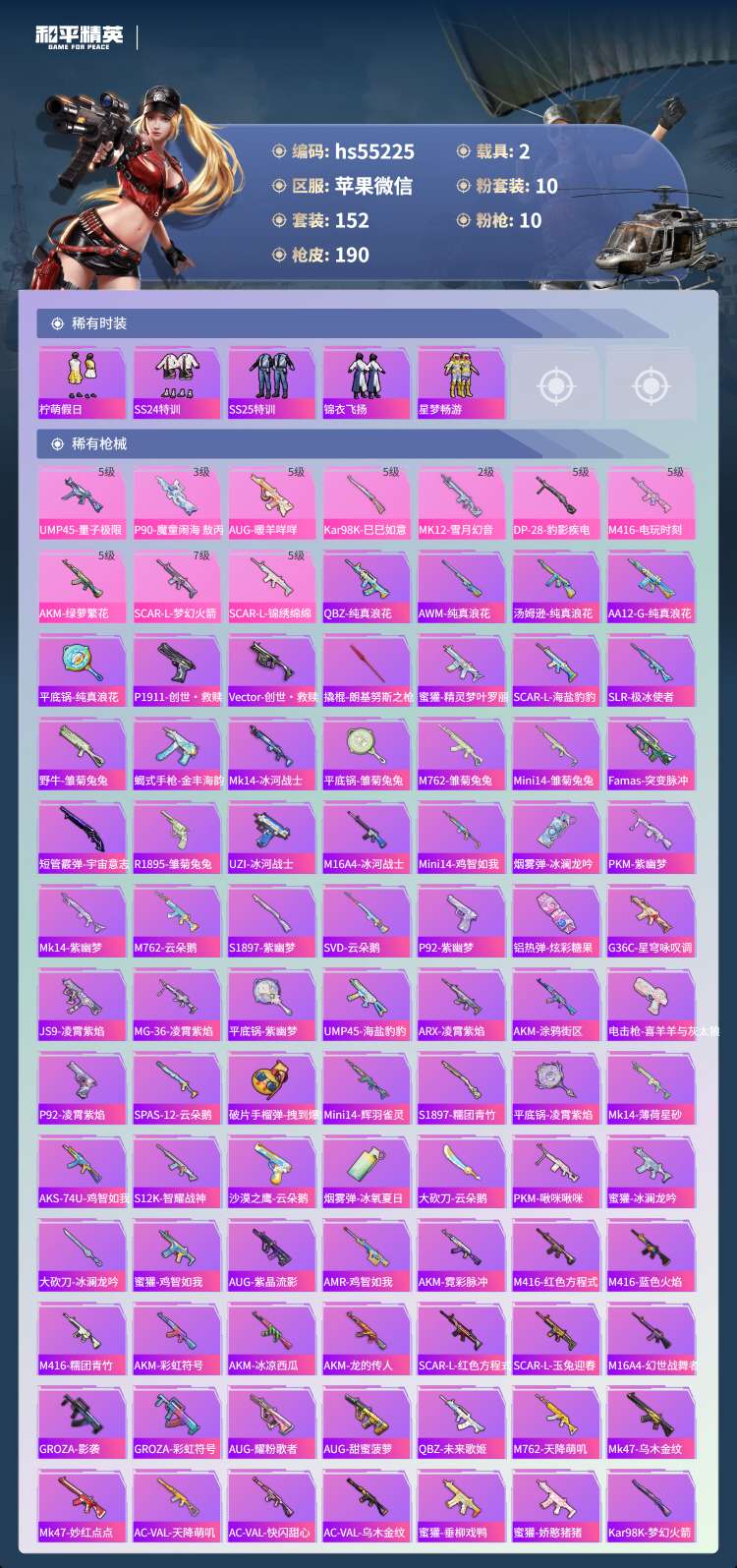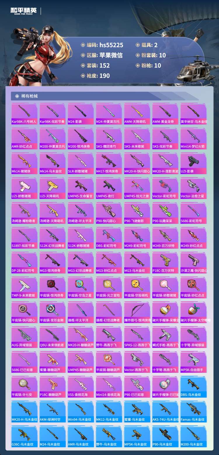 hs55225 苹果微-11王牌印记-1红装-10粉装-10特效枪-2载具-68404热力值-15