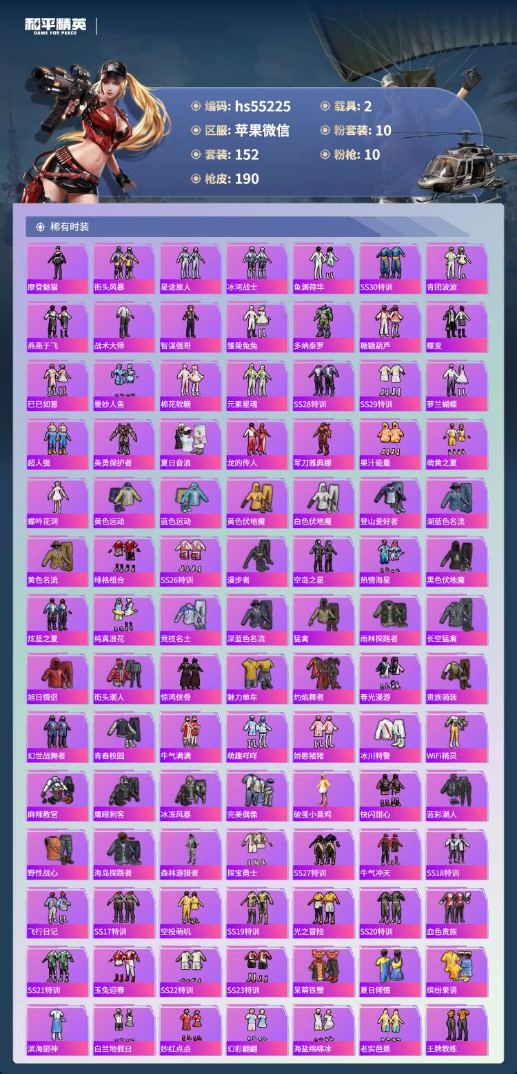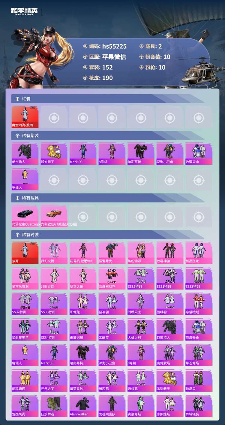 hs55225 苹果v-11王牌印记-1红装-10粉装-10特效枪-2载具-68404热力值-15