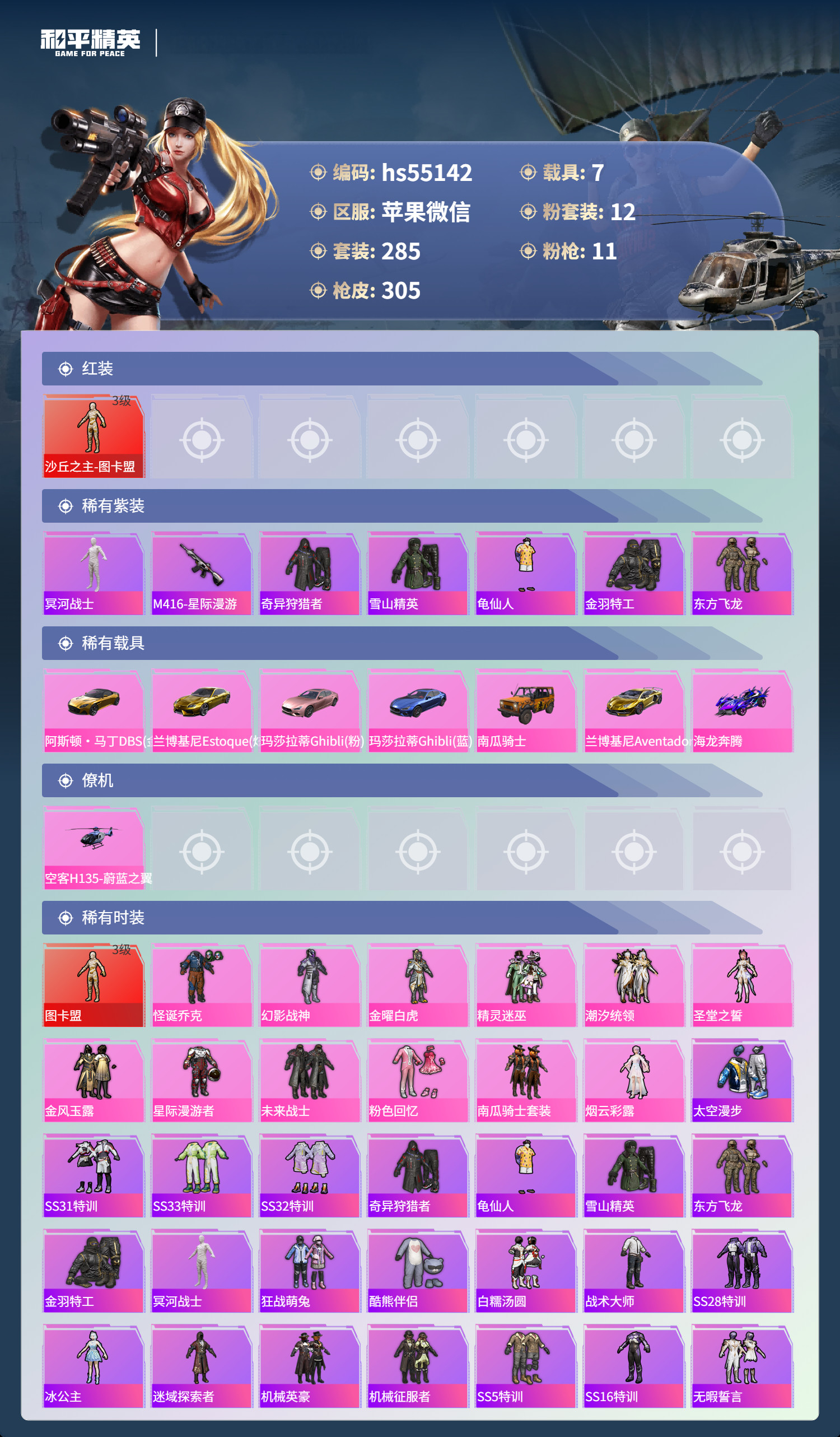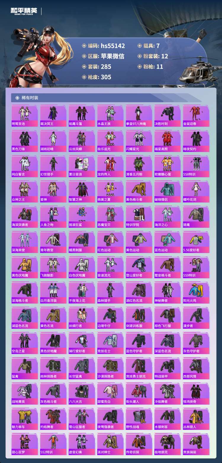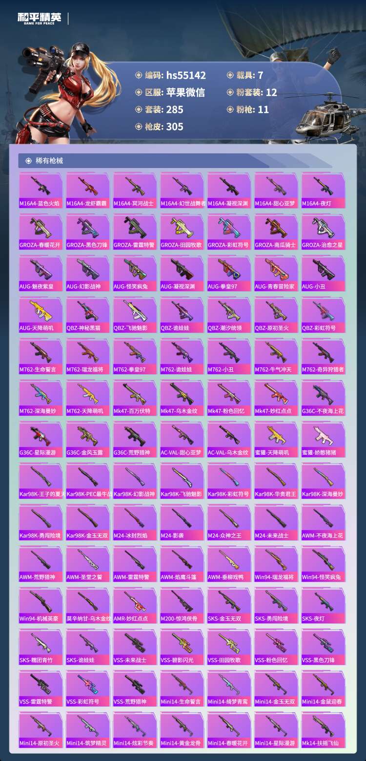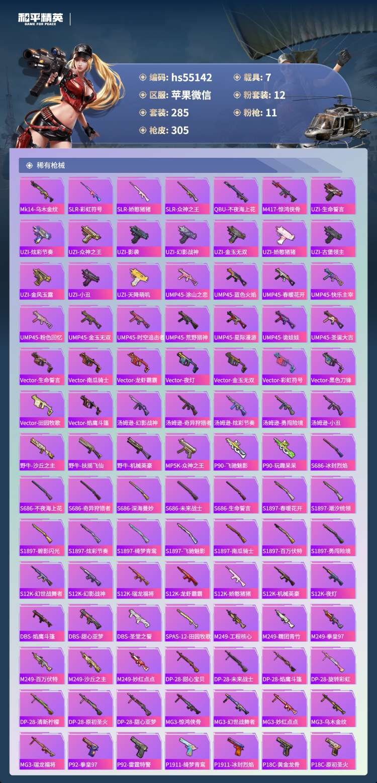 hs55142 苹果微-14王牌印记-1红装-12粉装-11特效枪-7载具-132346热力值-2