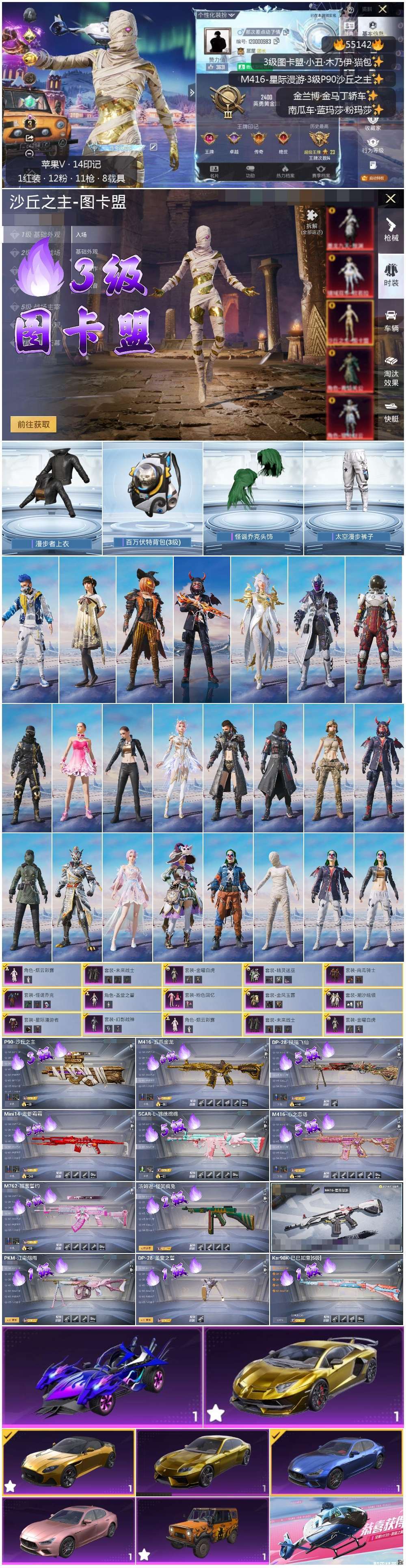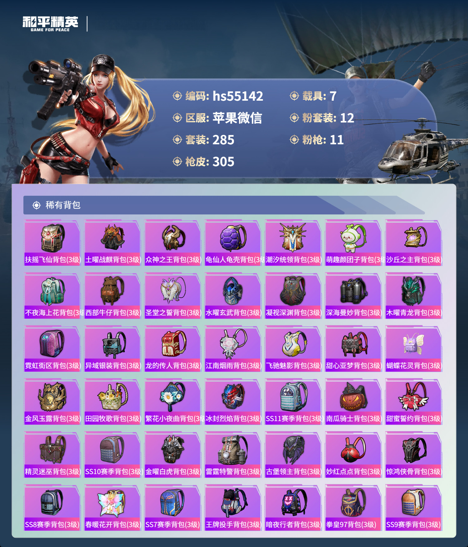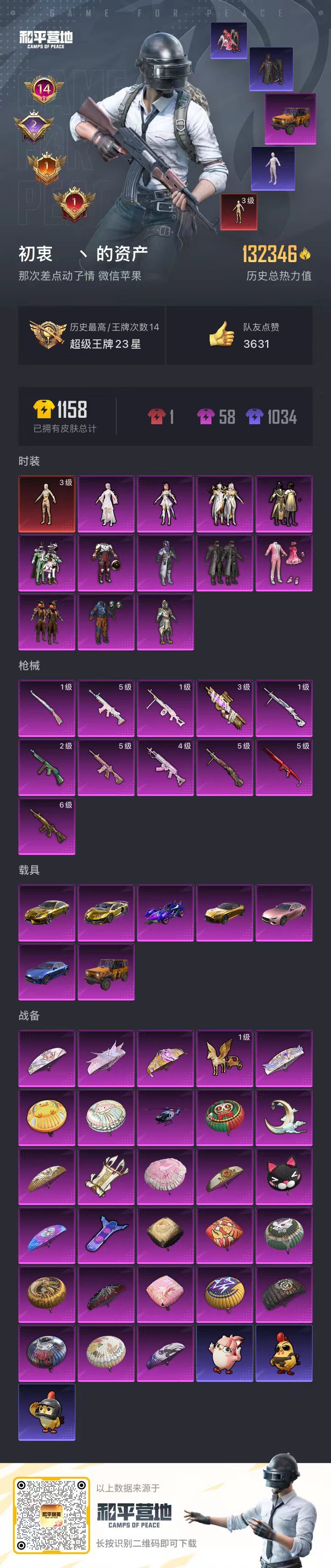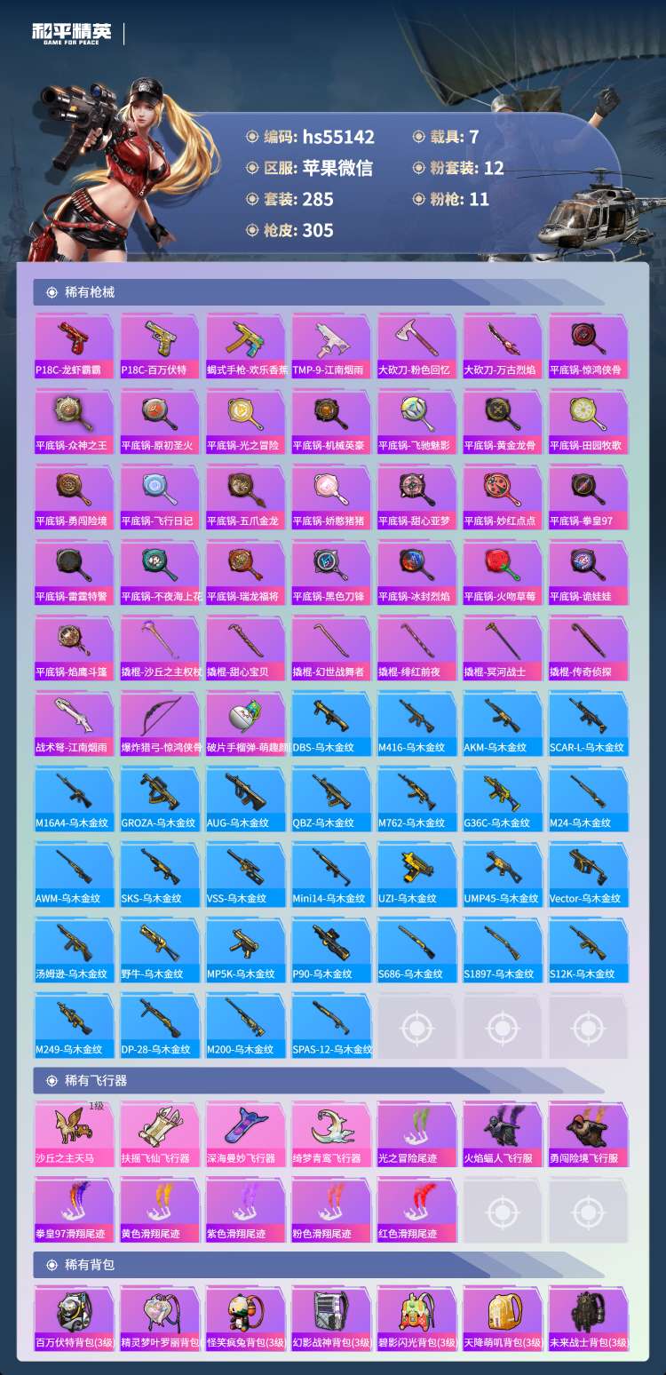 hs55142 苹果微-14王牌印记-1红装-12粉装-11特效枪-7载具-132346热力值-2
