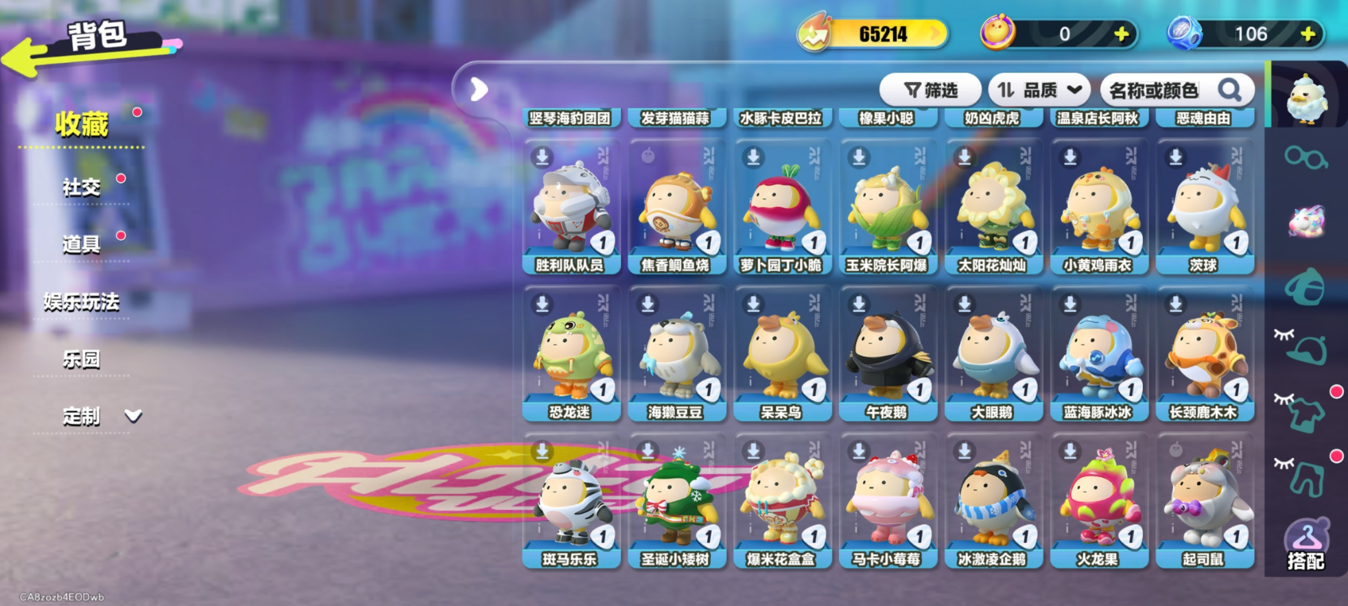 紫皮:双面教师林野,画中少女格蕾,元气丸子,刺猬绷绷,吟游诗人弥亚,狸猫大力,甲龙晶晶,超燃蛋小蓝,大娃,街头一霸骐哥,飞天小猪班尼,极光女神典伊,小太阳葵葵,沸羊羊,美羊羊,小灰灰,魔灯闪闪,白羽仙女索菲,雪王,流浪小象哆哆,熊猫岁岁,仙人掌丘丘,航天员莱卡,失心熊,水母尤莱亚,仓鼠米仔,机械鼓手贝克,