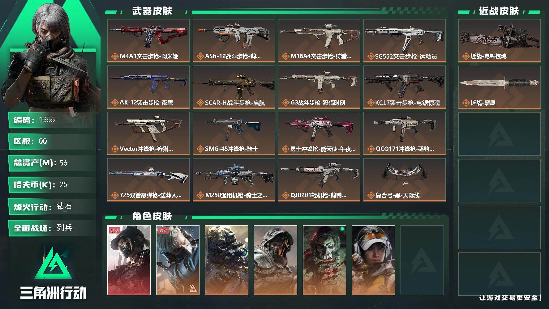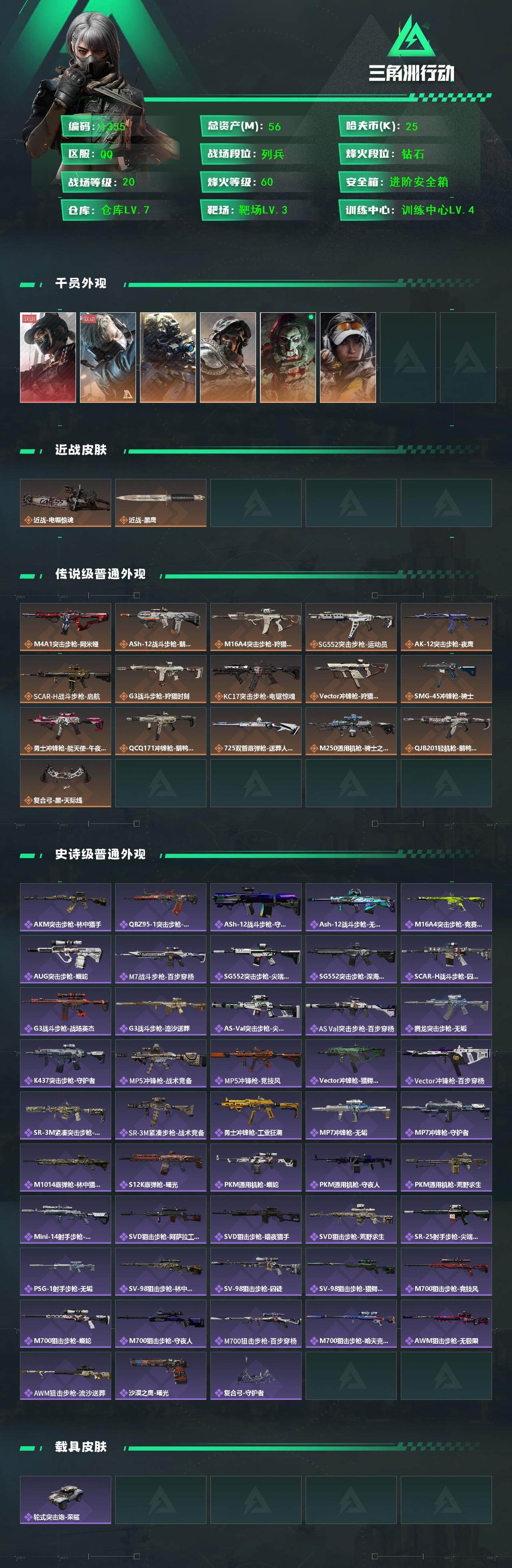 总资产(M):56M/哈夫币(K):25K/哈夫币(K):25K/全面战场等级:20_段位:列兵/烽