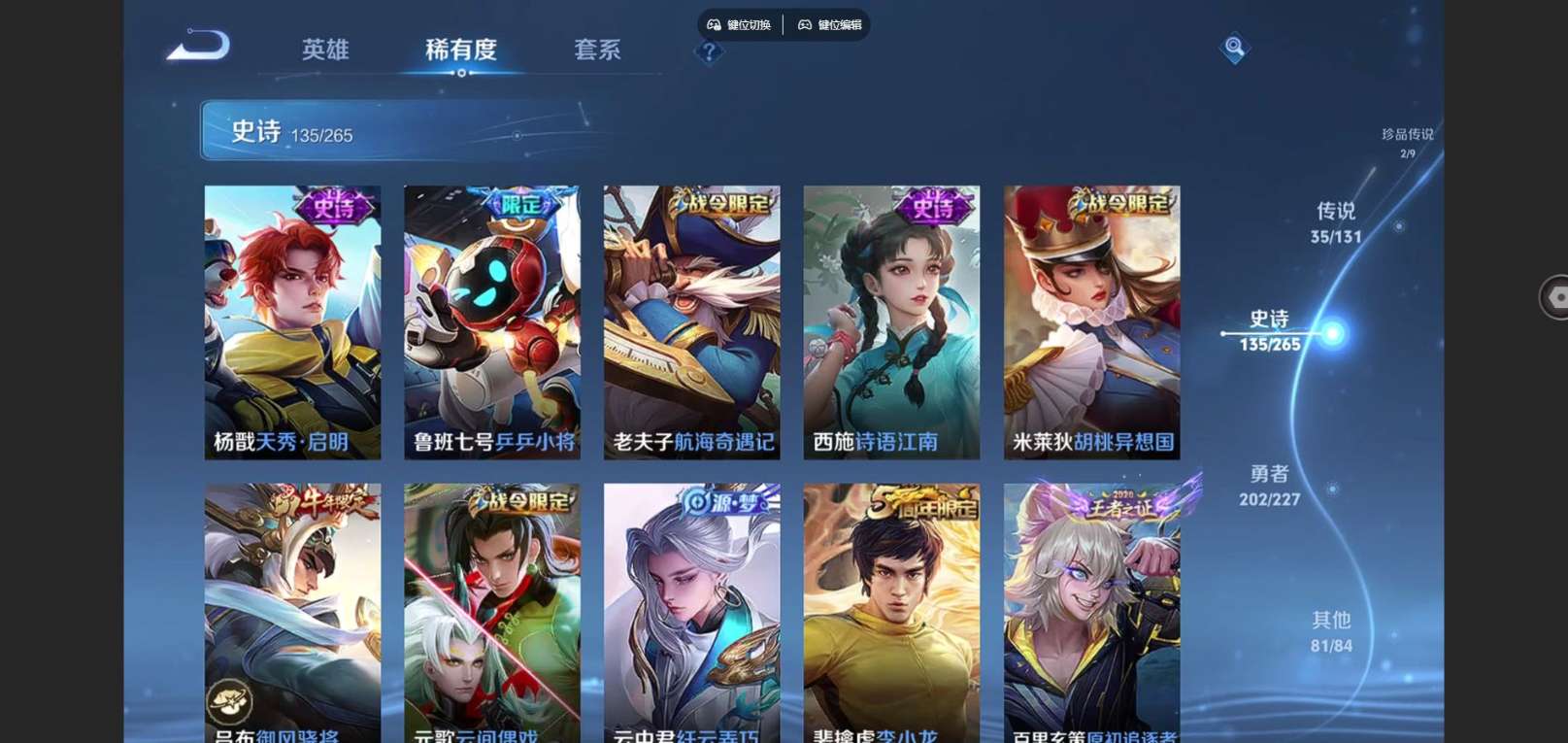 128英雄-458皮肤-V9-3典藏1无双2珍品传说35传说 打野32段 4星传说玉鸾吟 时之思念