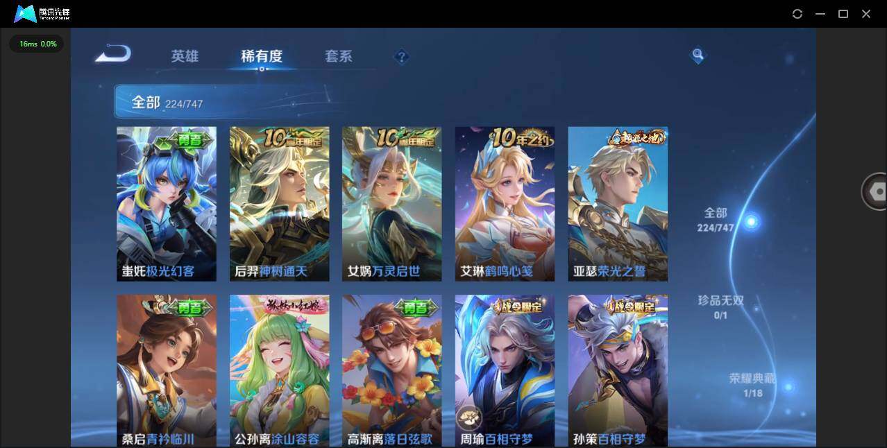 贵族等级: V7 英雄数: 127 皮肤数: 224 荣耀水晶: 星域神启 传说皮: 炽阳神光,地狱火,零号·赤焰,妄想实况,神树通天 限定皮: 李小龙,烈魂,天狼绘梦者,至尊宝,大圣娶亲,鸣野蒿,逐霄战戟,愿照·岁时盈