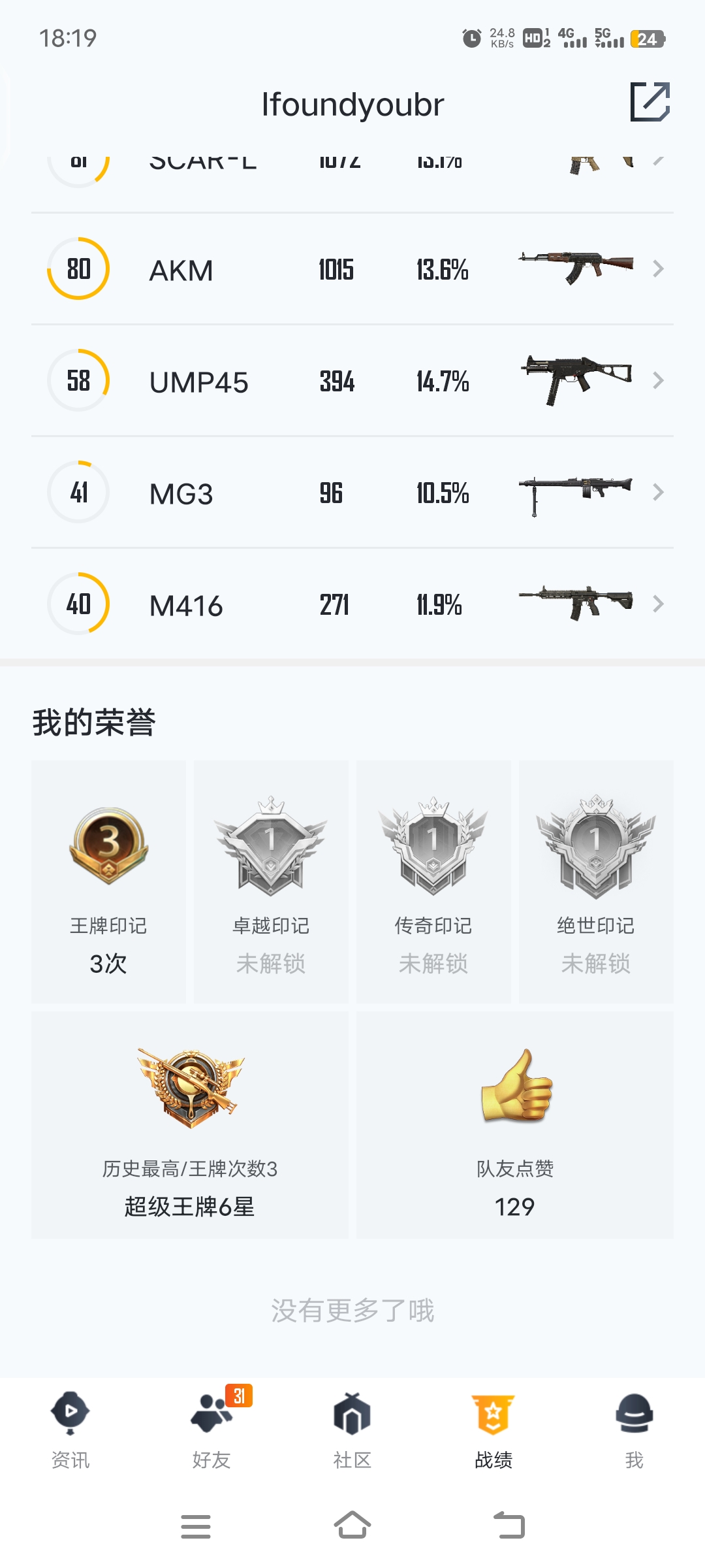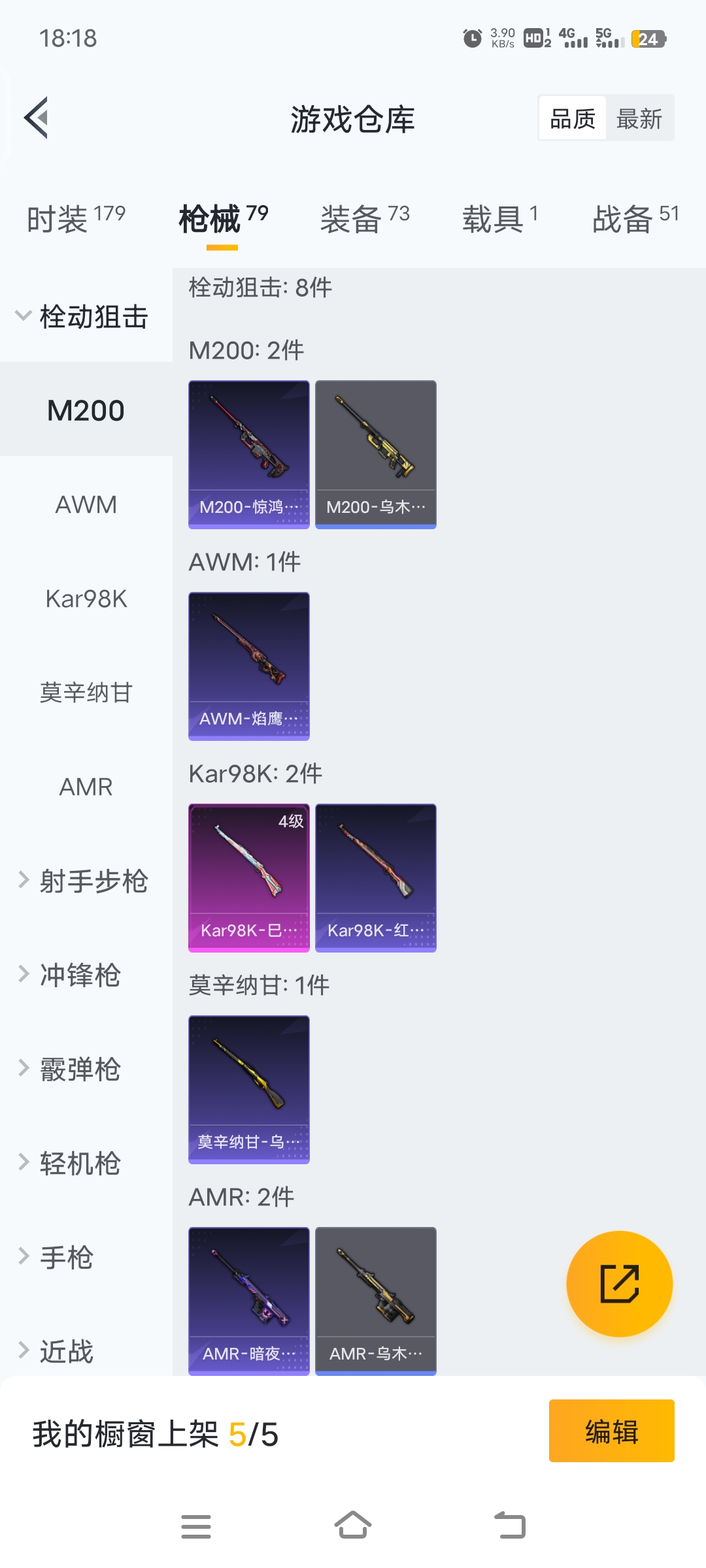 两套粉装,1车子,5级scar特效枪,4级98k特效枪,6级spas特效枪,
