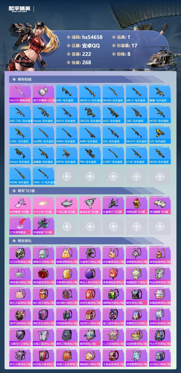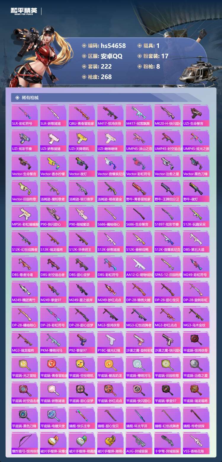 hs54658 安卓手Q-15王牌印记-17粉装-8特效枪-1载具-92442热力值-222套装-2
