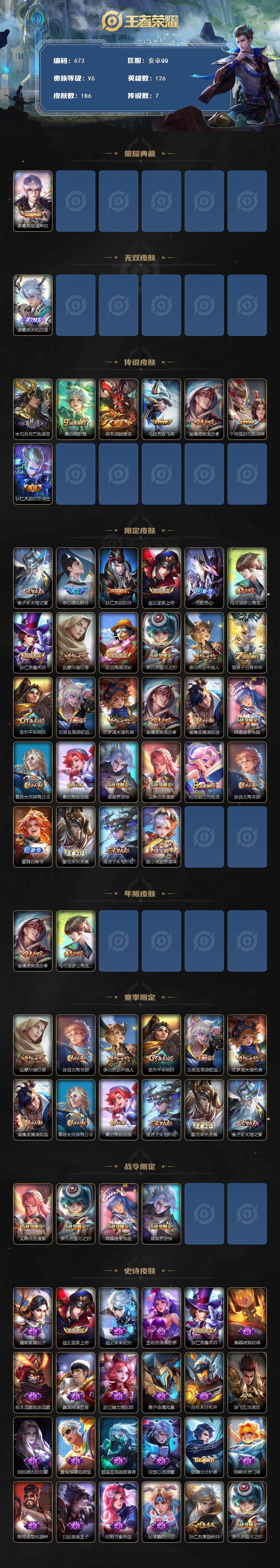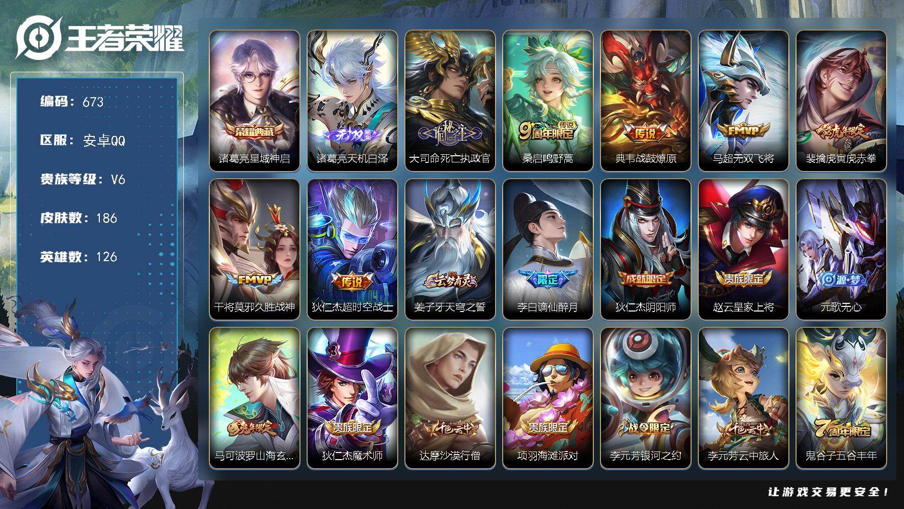 /1860180 王者荣耀账号 安卓Q-V7-最强王者段位-126英雄-186皮肤-1典藏皮肤-1无双-7传说-49史诗