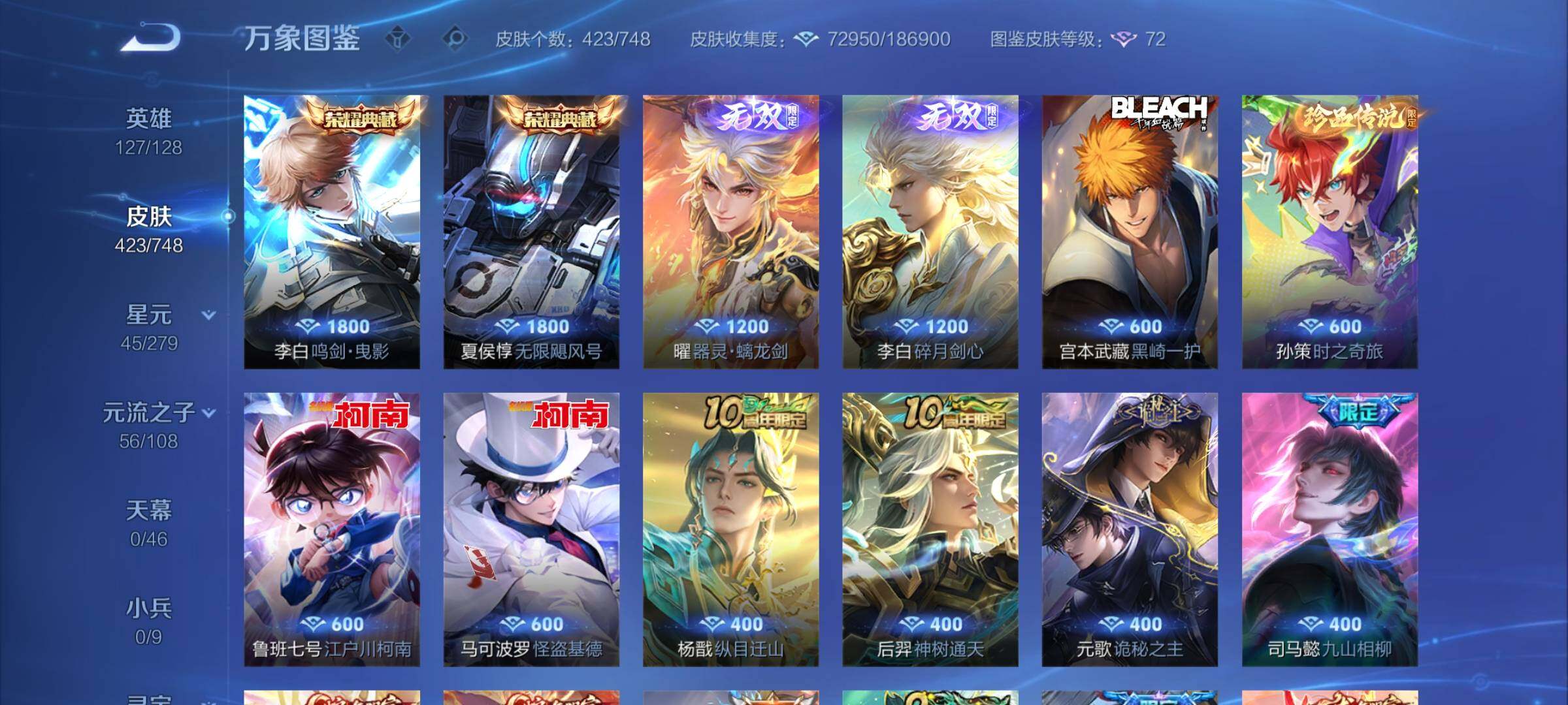 【店长推荐·差3.1W积分V10·2典藏·2无双·4珍品·3星传说·44传说·27按键·曜器灵螭龙剑·鸣剑曳影·无限飓风号·马可怪盗基德·鲁班柯南·孙策时之奇旅·黑崎一护·全皮守约·全皮夏侯惇·全皮元歌·可二次】YXw9174-安卓q区服-127英雄-423皮肤-9王者印记-280铭文-贵族积分15w【贵族9】【因赛季更新游戏段付以上号为准!】