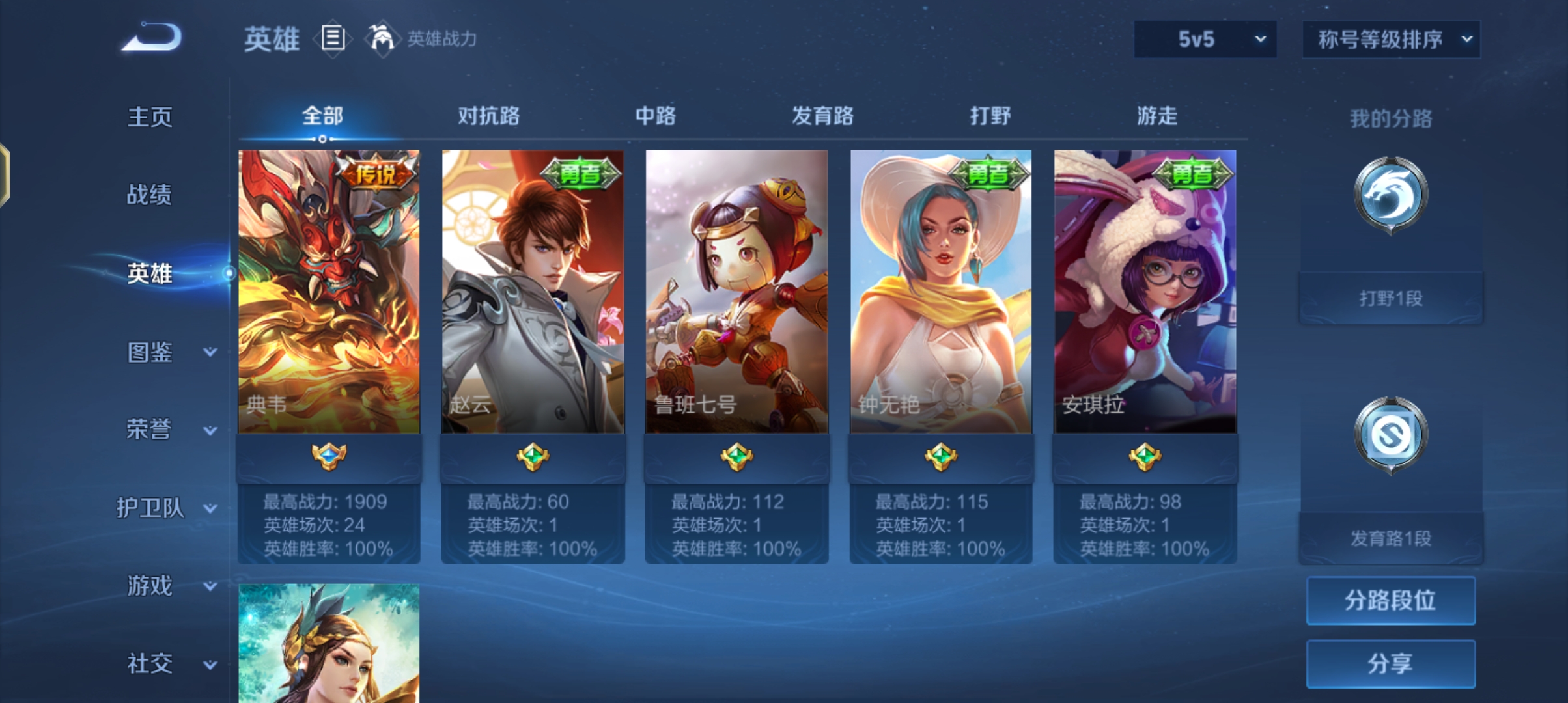 典韦打野小号。高胜率。叱咤全皮肤,赵云两个勇者皮。