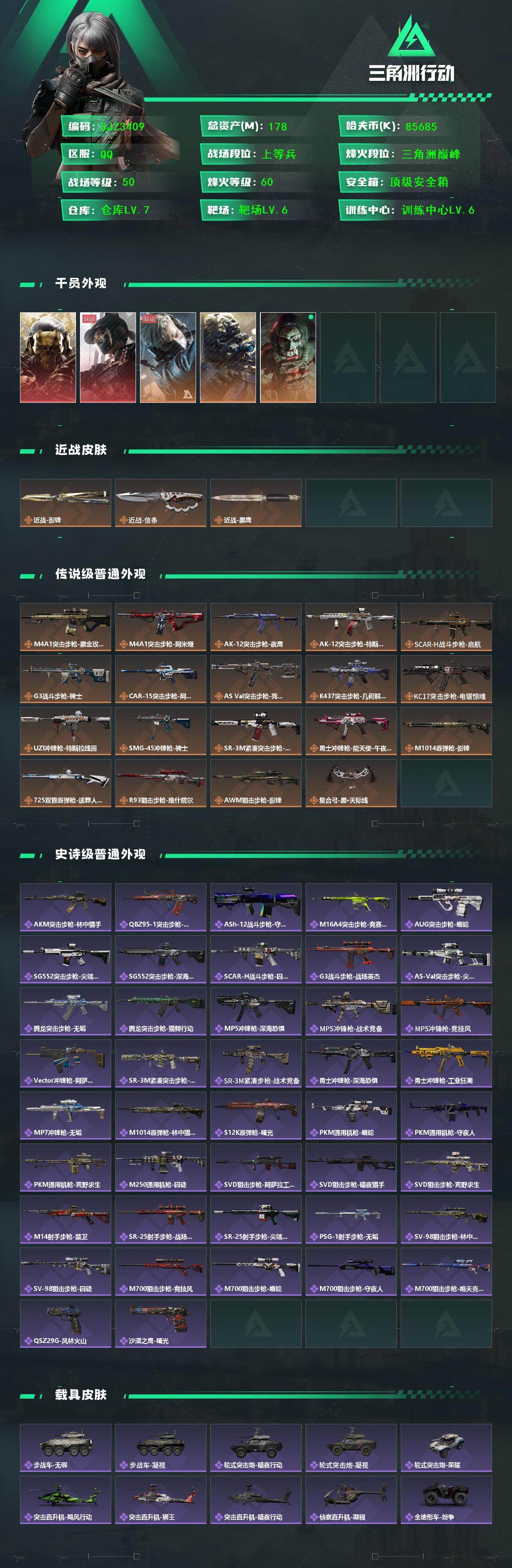 【SJZ3409】总资产(M):178M/哈夫币(K):85685K/哈夫币(K):85685K/全面战场等级:50_段位:上等兵/烽火地带等级:60_段位:三角洲巅峰/红狼-蚀金玫瑰/露娜-黑·天际线/蜂医-送葬人·无题密令/无名-夜鹰/红狼-电锯惊魂/近战-影锋/近战-信条/近战-黑鹰/M4A1突击步枪-蚀金玫瑰/M4A1突击步枪-阿米娅/AK-12突击步枪-夜鹰/AK-12突击步枪-特斯拉线圈/SCAR-H战斗步枪-启航/G3战斗步枪-骑士/CAR-15突击步枪-阿米娅/AS Val突击步