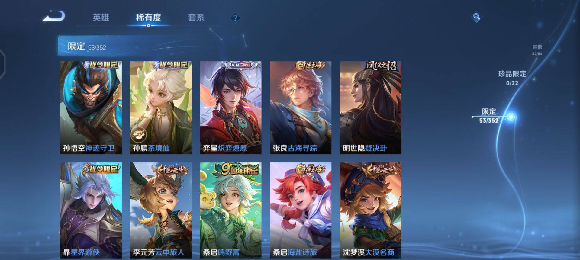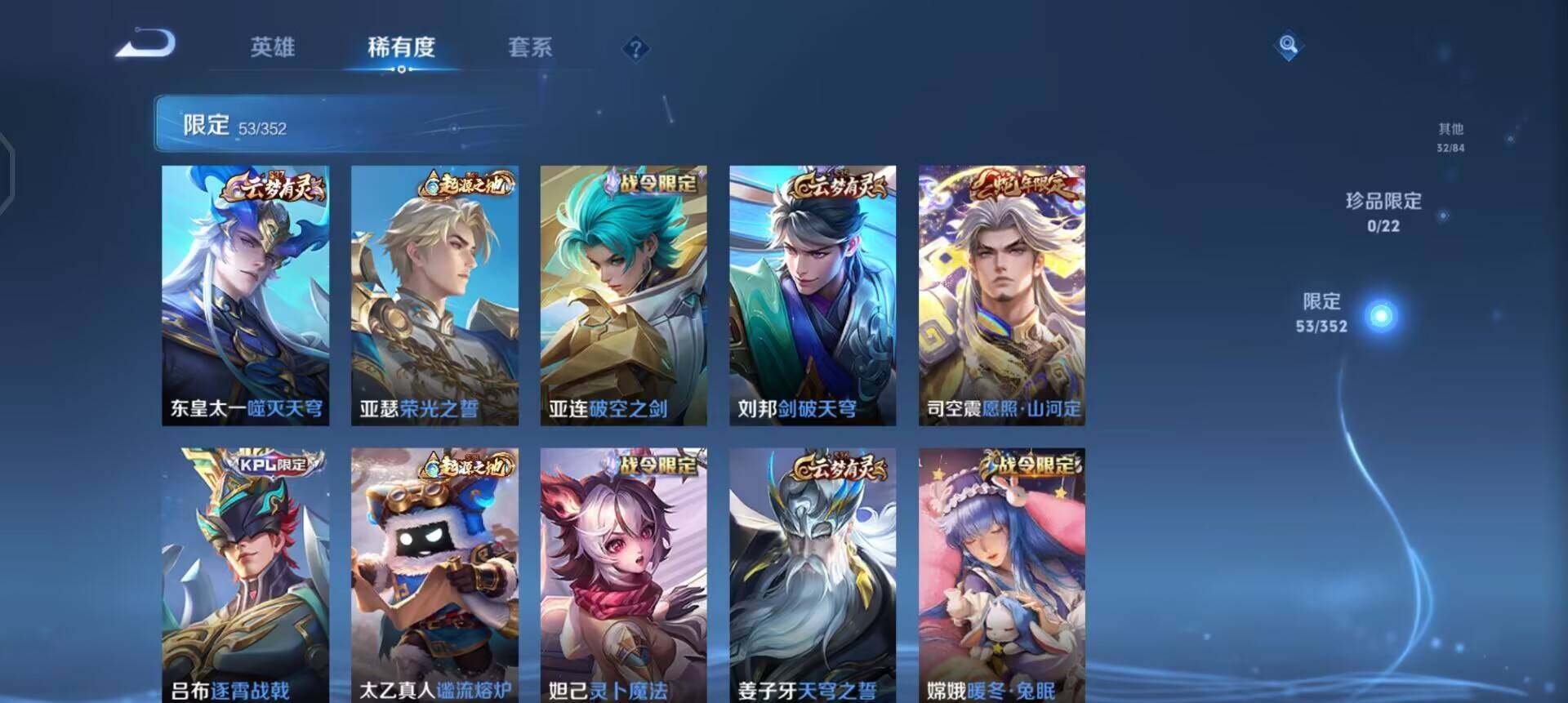 【限定皮肤】:姜子牙天穹之誓,狄仁杰阴阳师,赵云皇家上将,高渐离玩趣恶龙,
