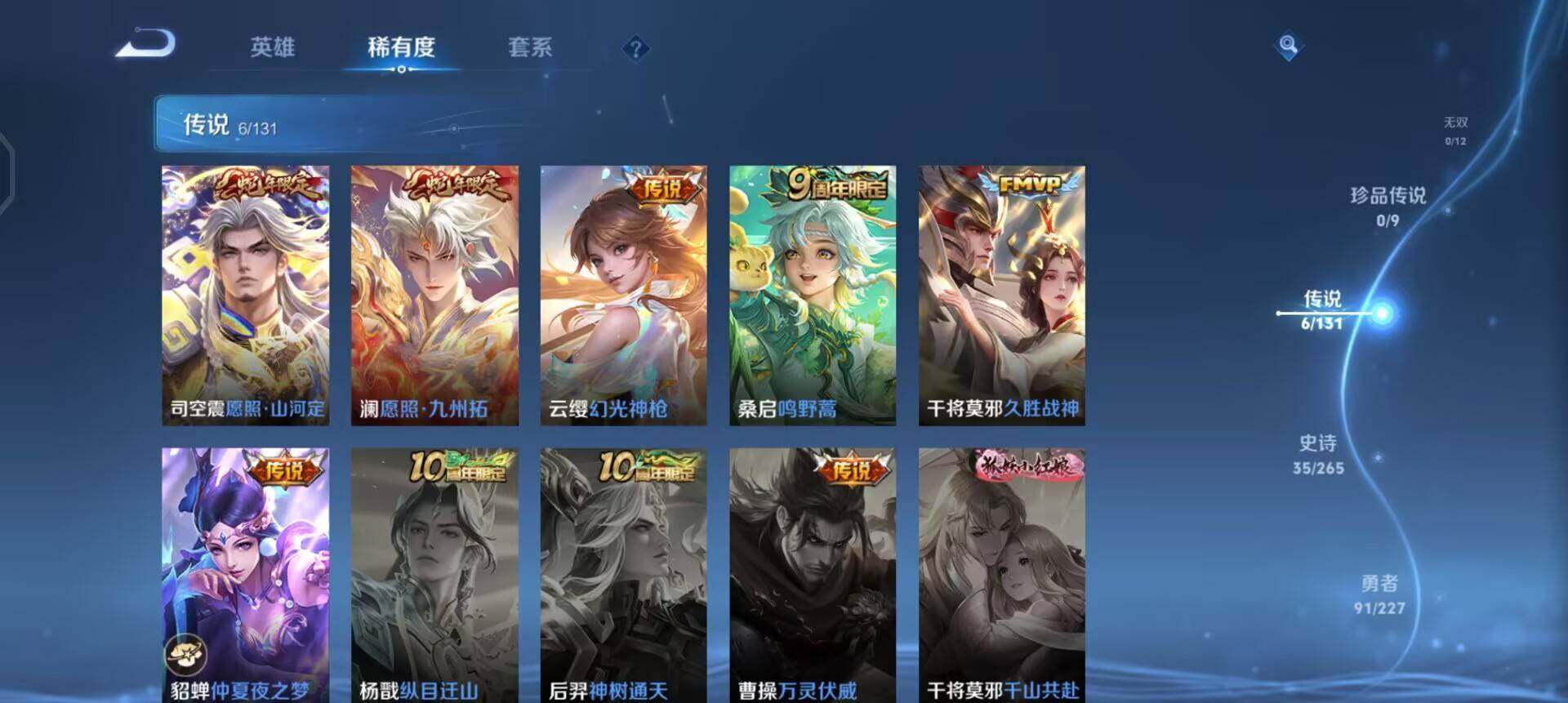 【传说皮肤】:司空震愿照山河定,澜愿照九州拓,云缨幻光神枪,桑启鸣野蒿,干将莫邪久胜战神,貂蝉仲夏夜之梦