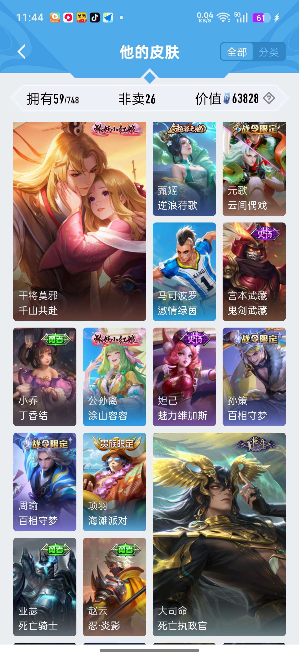 苹果QQ/荣耀王者/59皮肤/80英雄/1典藏/0珍品无双/2无双/0珍品传说/6传说/24史诗/7