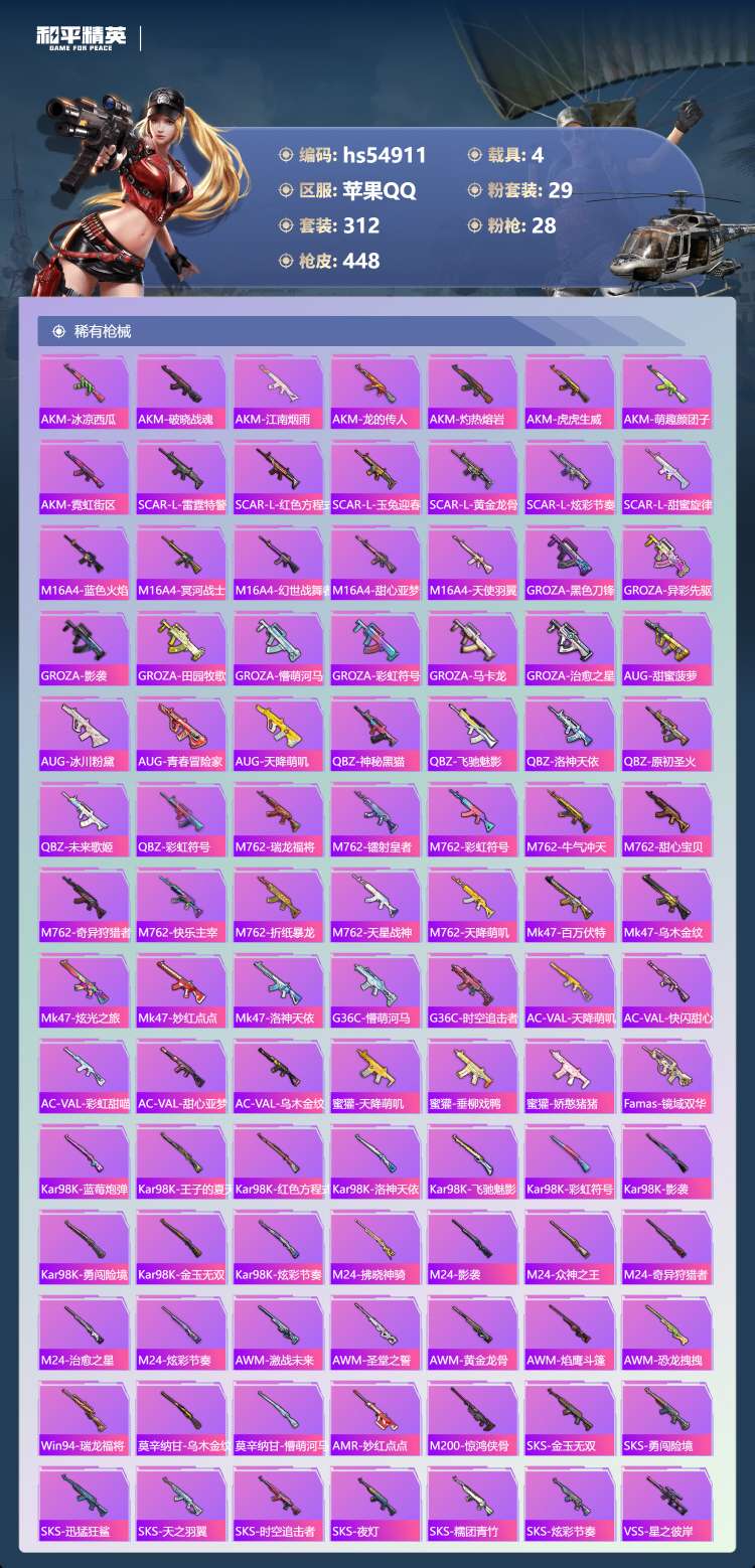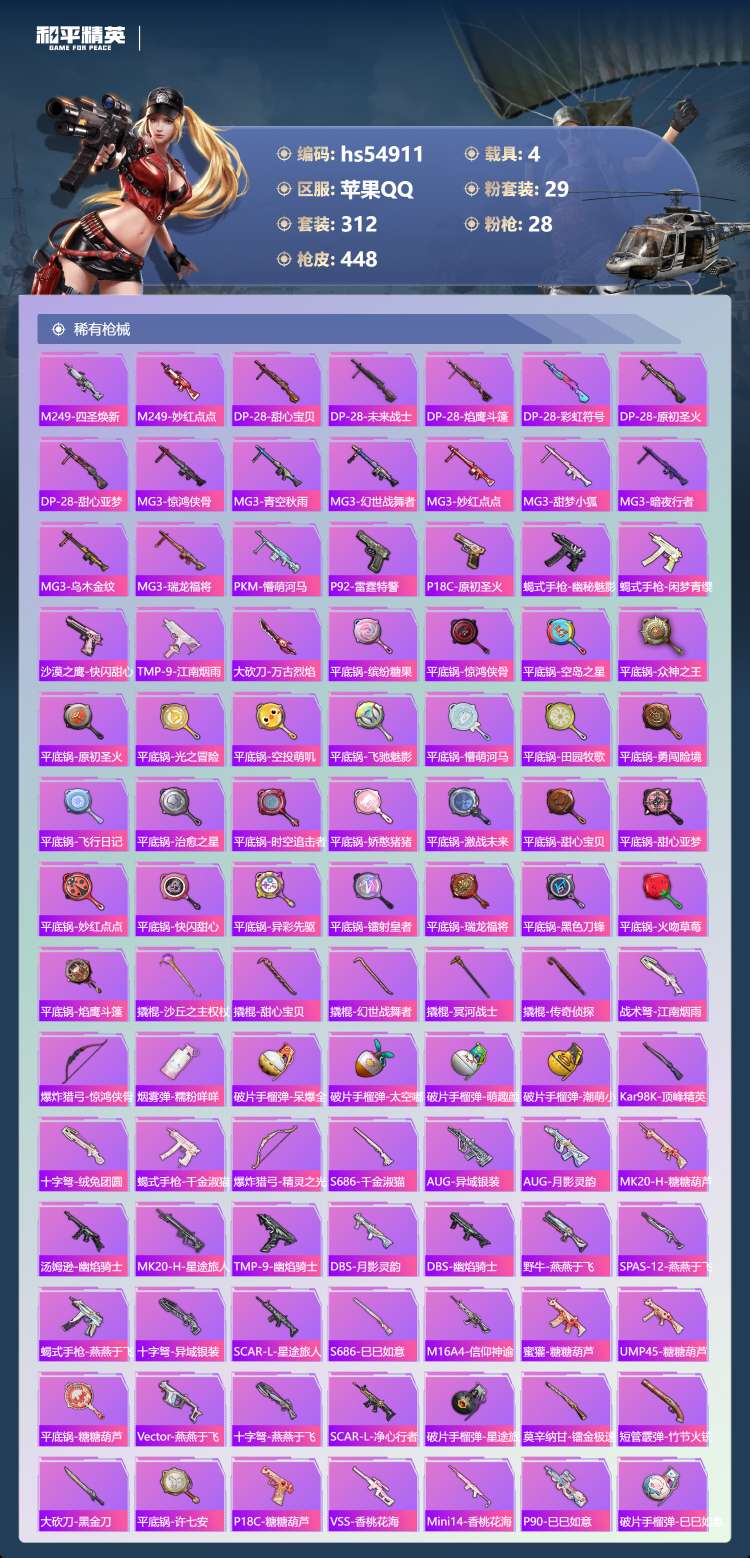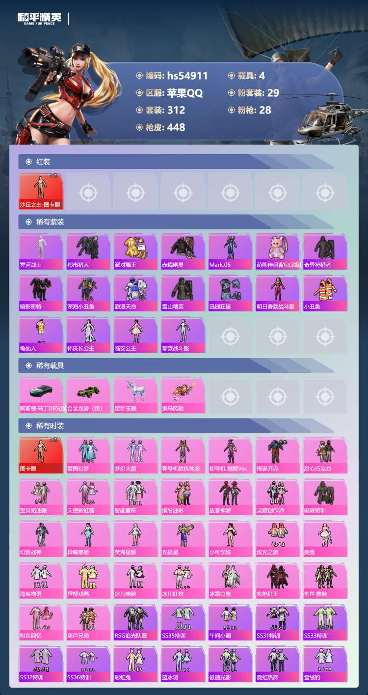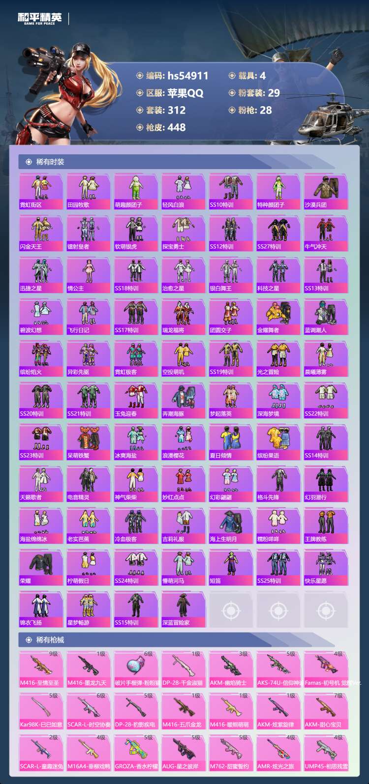 hs54911 苹果手Q-29王牌印记-有战神框-1红装-29粉装-28特效枪-4载具-168510
