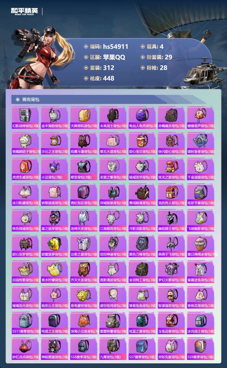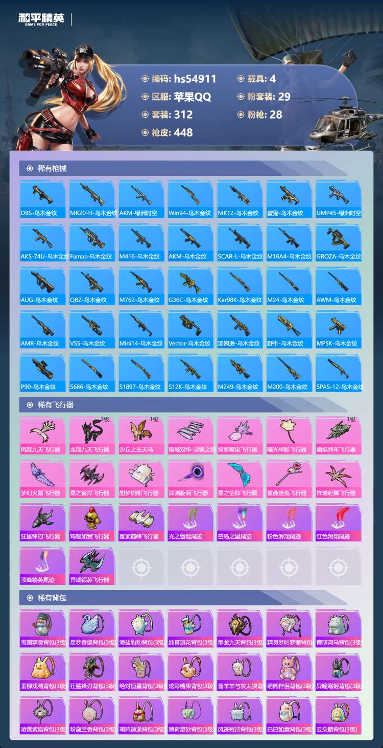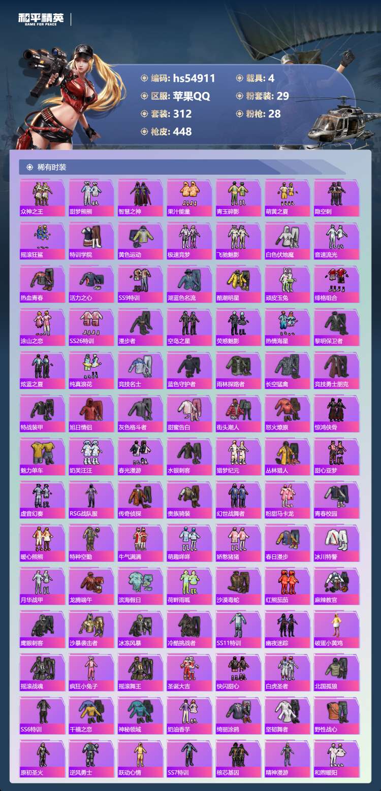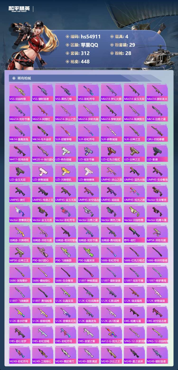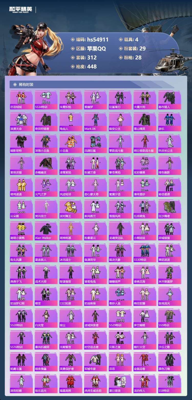 hs54911 苹果手Q-29王牌印记-有战神框-1红装-29粉装-28特效枪-4载具-168510
