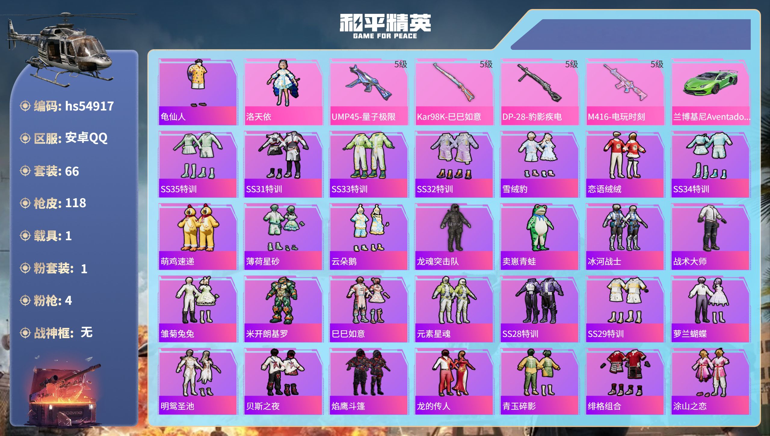 hs54917 安卓手Q-11王牌印记-1粉装-4特效枪-1载具-33718热力值-66套装-118